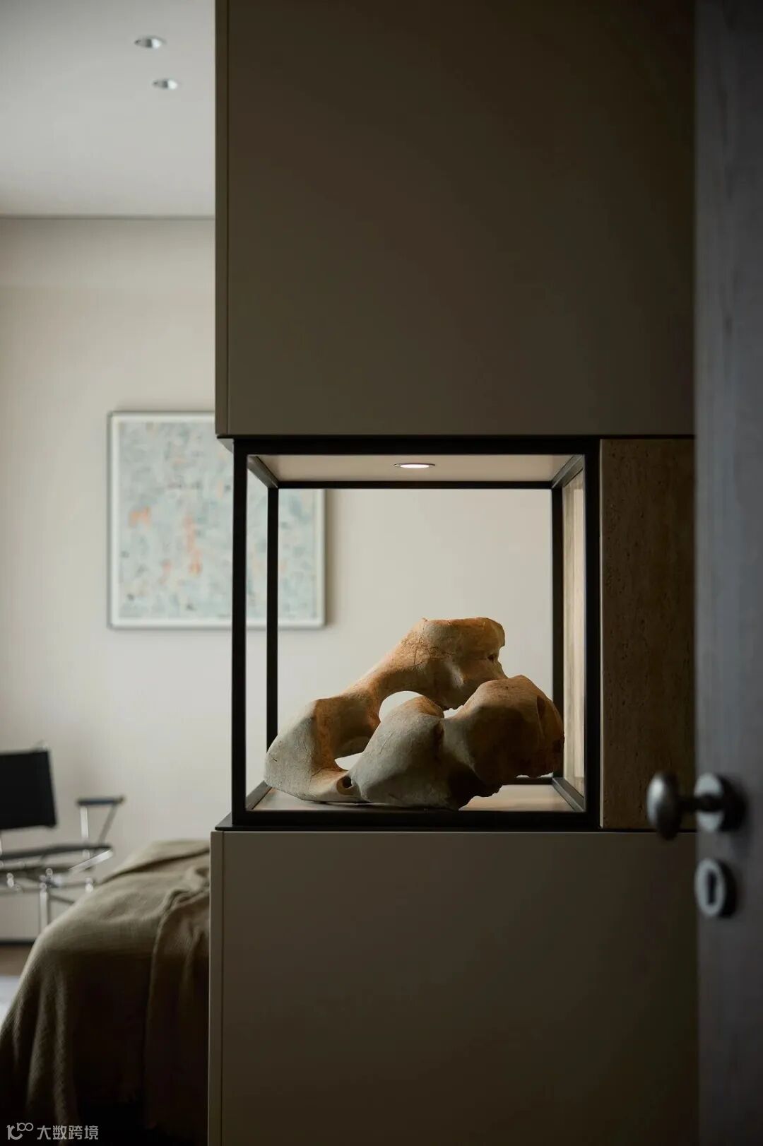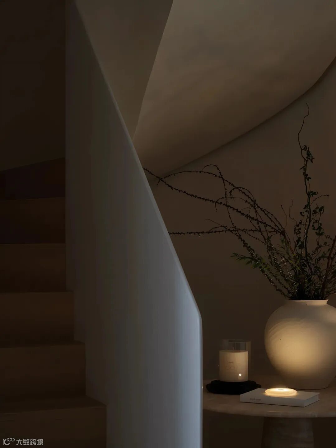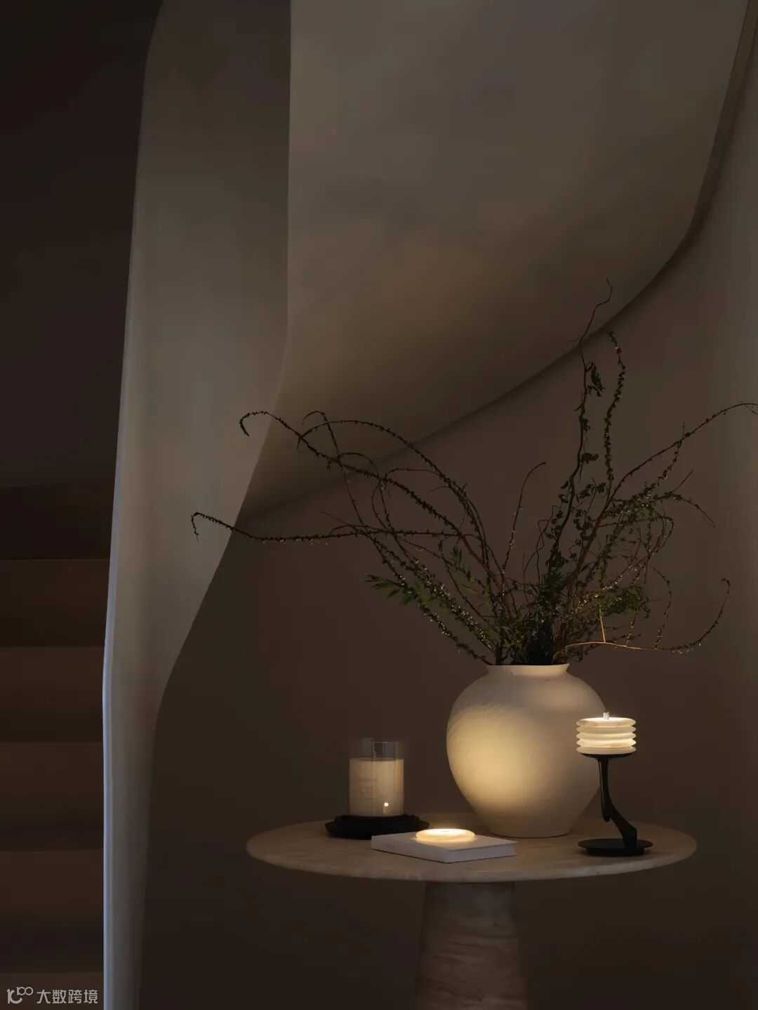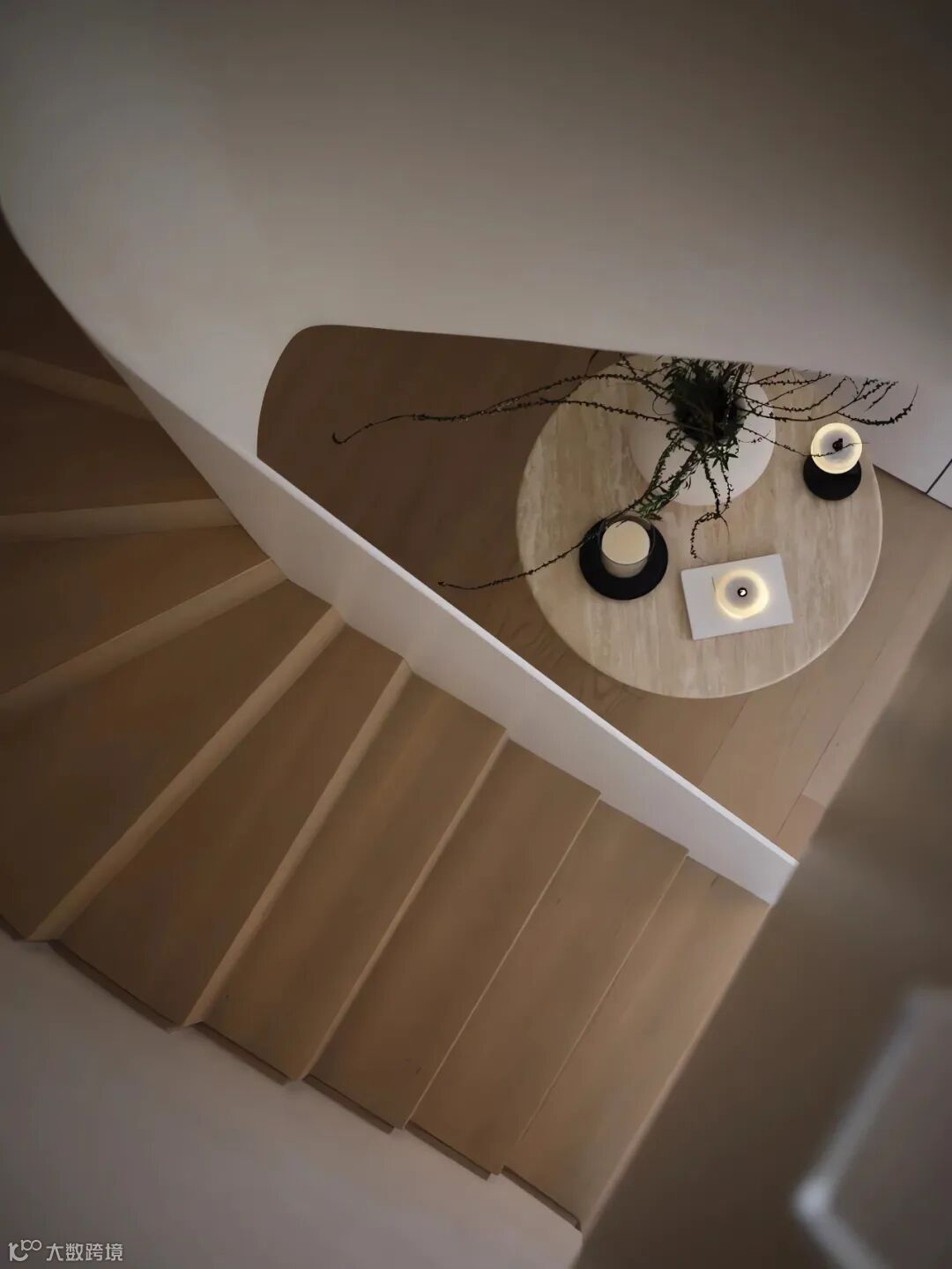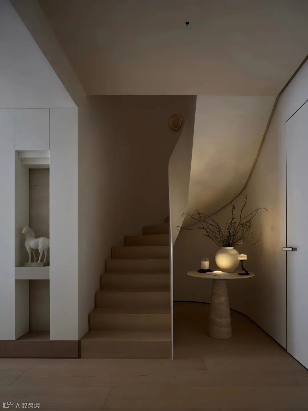 这方旋阶以极简东方的肌理,成了空间里的 “诗意转场带”:浅木裹着暖,弧面揉着柔,旁侧的装置台藏着雅,连上下楼的脚步,都成了静奢的节奏。嵌入墙身的台架,一半藏起日常杂物,一半承起雕塑、花艺 —— 白瓷马像东方案头的清供,枯枝花艺是水墨里的疏影,让 “实用” 与 “雅意” 不割裂。