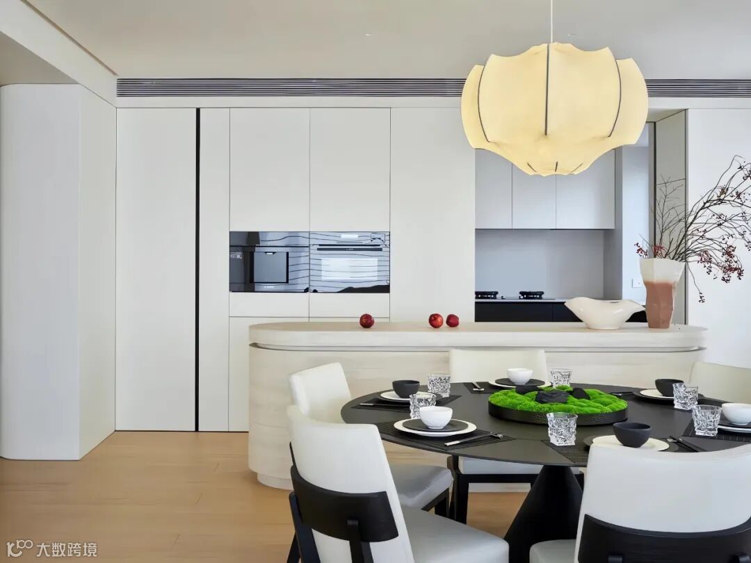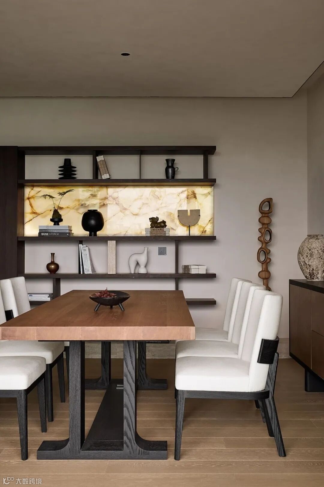 餐厅置物架兼作展陈柜体,收纳各式器物,中部透光石晕染出温润光晕,灯槽暗引柔光漫入,恰似将中式园林“借光造景”的巧思移入餐厨空间。