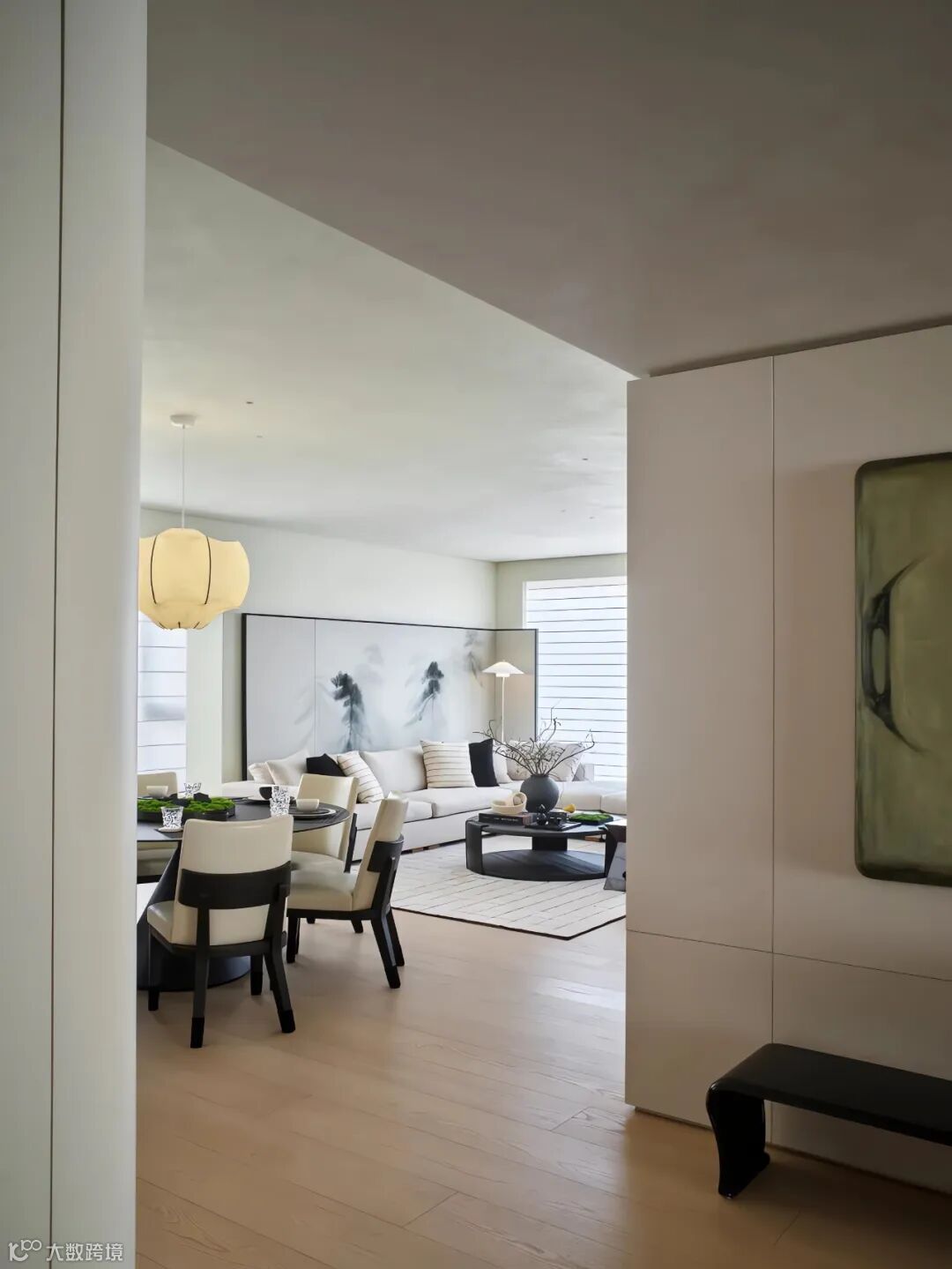 脚步向内延伸,客厅的雅致意境方才逐步铺陈,宛如中式卷轴徐徐舒展的韵律,将“一眼望穿”的直白感,转化为步步生悠的东方栖居节奏。