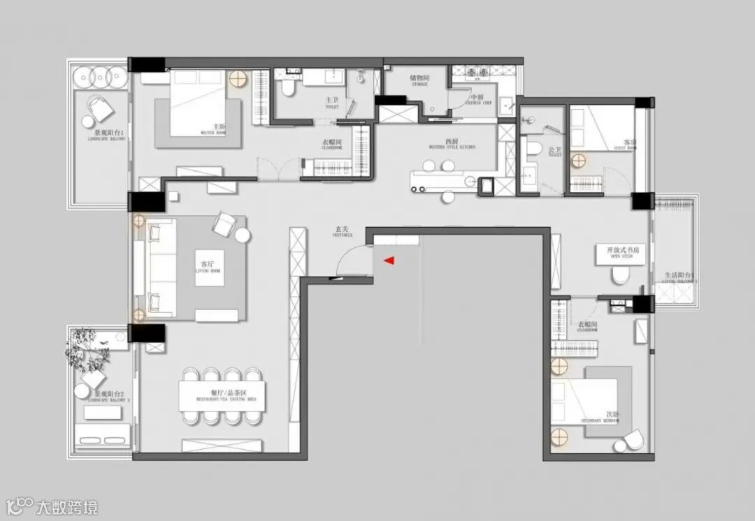 本套住宅以 “东方公馆” 为核心主题,打造文人雅士的理想居所,贴合“有文化、有视野、偏爱东方生活态度”的居住者需求;设计秉持东情西韵理念,用西方现代手法构建空间骨架,墙面墙板等细节融汇东西美学,让传统东方意境与国际化格调浑然天成。