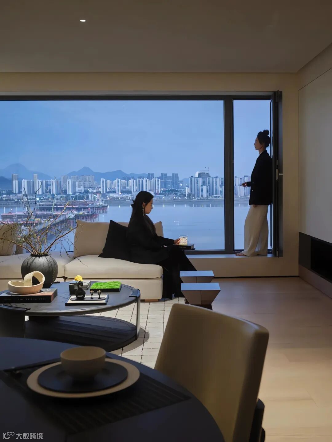 客厅没做繁复的装饰,只以极简的东方肌理,接住一窗奔涌的江景,把 “观潮” 的松弛,揉进了日常的坐卧里。朋友围坐时,视线自然落向江景的舒展。观的是江潮,享的是日子里,藏不住的松弛质感。