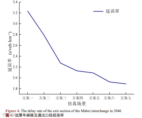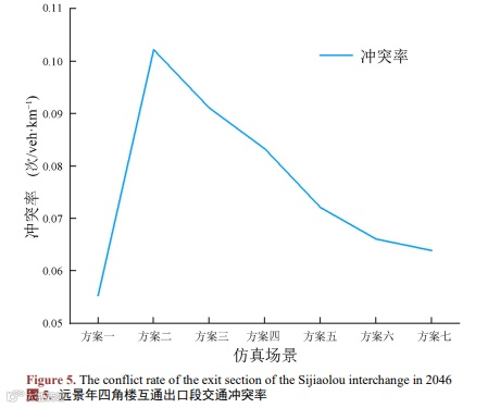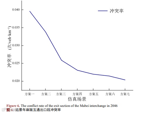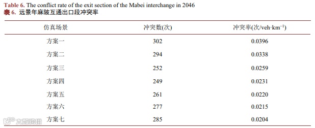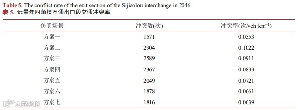(3) 仿真结果表明,相较于麻陂互通,四角楼互通整体车辆通行效率较低,车辆冲突率较高。主要原因是主线相互合流点至四角楼互通出口渐变段起点的距离仅为400 m,间距较近,车辆的换道行为较为密集,对路段的通行效率及安全影响较为显著。