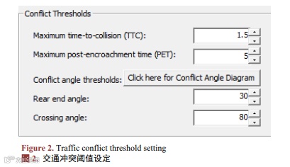 将VISSIM仿真模拟生成的trj轨迹文件加载到SSAM软件中,调整SSAM软件参数,得出不同交通冲突类型的冲突数。对于冲突角度及PET、TTC的阈值,各次仿真实验均按照SSAM软件中的默认取值进行设定(图2)。