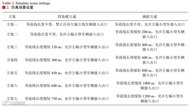 本文以河惠高速公路改扩建四角楼互通、麻陂互通项目为研究对象,其中四角楼互通原方案主线合流导流线750 m,主线合流点至出口距离约为400 m;麻陂互通原方案主线合流导流线1800 m,主线合流点至出口距离约为1700 m。合流点距离互通出口距离较近,主线靠左行驶的车辆可能没有足够距离完成换道并驶入出口。为确定合流点与互通出口间合理交通组织方案,本文对不同合流导流线长度下上述两个互通进行模拟仿真,具体仿真场景如表2所示。