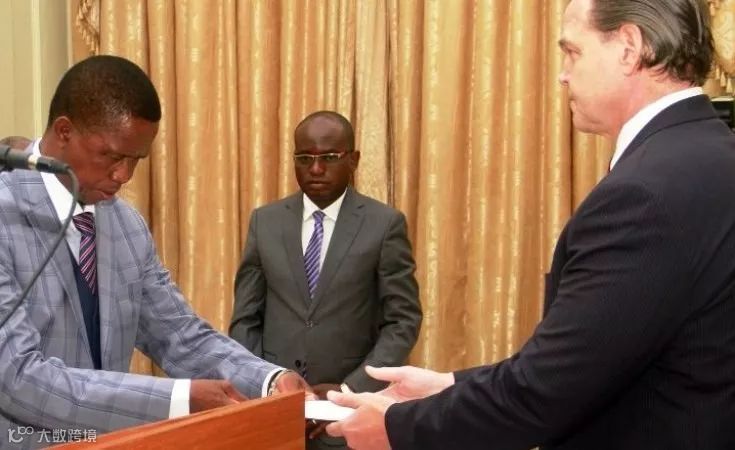2017年,美国驻赞比亚大使丹尼尔·富特向赞比亚总统伦古递交国书。来源:美国驻赞比亚大使馆
