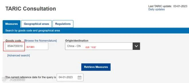 如下图所示,输入海关编码,并选择“China-CN”,敲“回车”或点击”Retrieve Measures”进行查询: