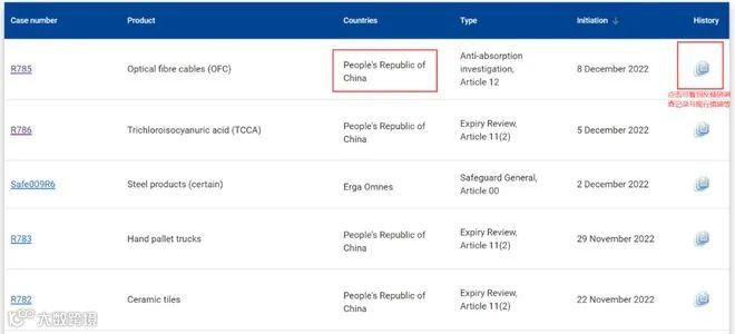 点开下图所示右边的文件记录,可以看到反倾销调查记录和现行措施等文件列表。