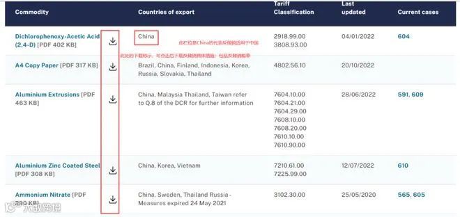 打开网页显示的是所有国家到澳大利亚的反倾销产品汇总表,“Countries of export”栏位是“China”的,代表此产品中国-澳大利亚是反倾销的。