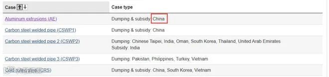 打开网页显示的是所有国家到加拿大的反倾销产品汇总表,在“Case type”栏位显示有“China”的,表示此产品中国-加拿大是反倾销的。