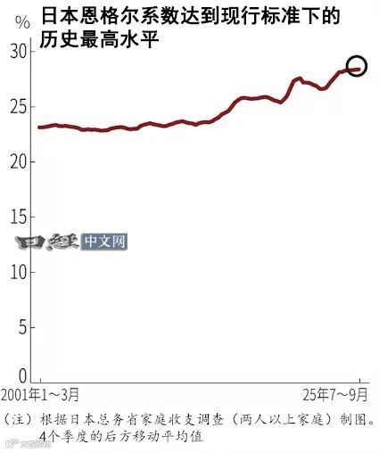日本总务省《家庭收支调查(两人以上家庭)》显示,2025年7~9月恩格尔系数达29.4%,为2000年采用现行统计标准以来的季度最高值。剔除季节性影响的4个季度后方移动平均值为28.4%,亦为有可比数据以来最高。2025年10月单月数据仍维持在29.3%高位 [2] 。