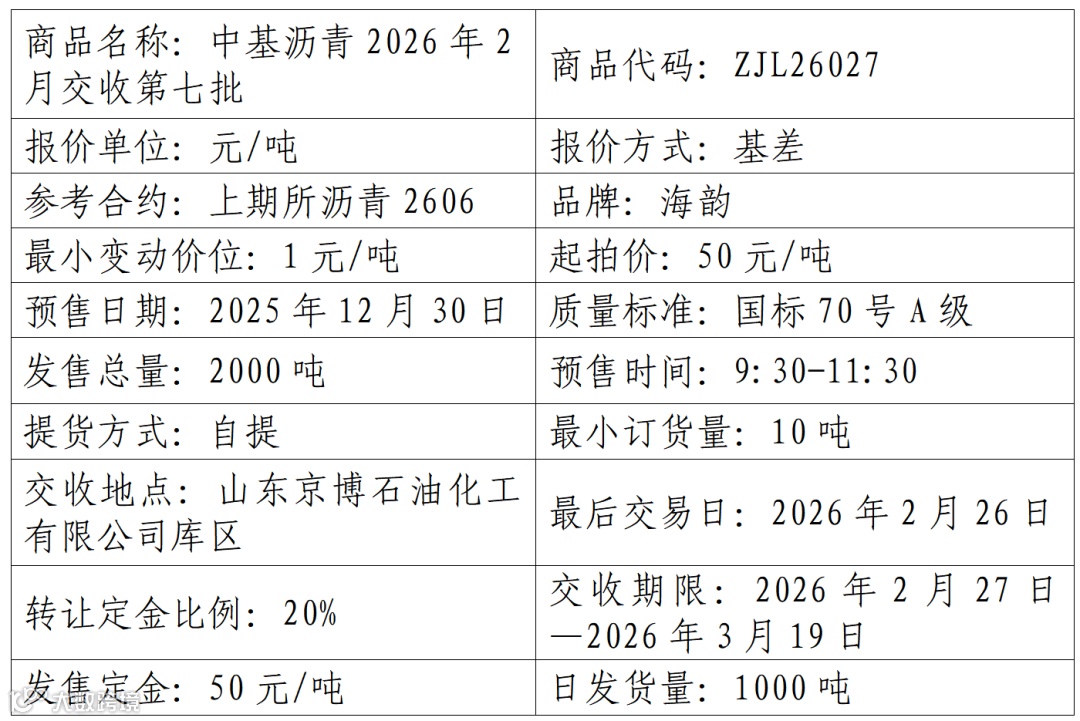 中基宁波集团股份有限公司定于2025年12月30日在产能预售系统中发售2026年2月交收第七批沥青产品,具体信息如下: