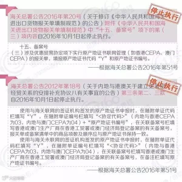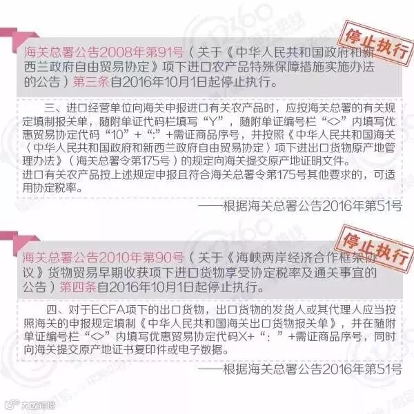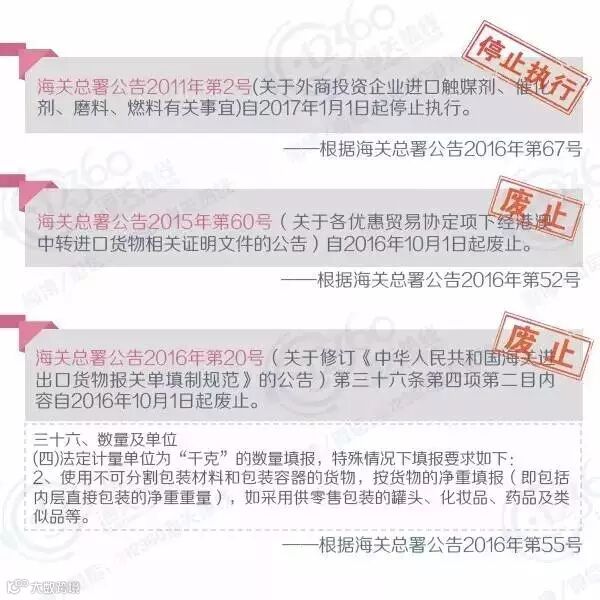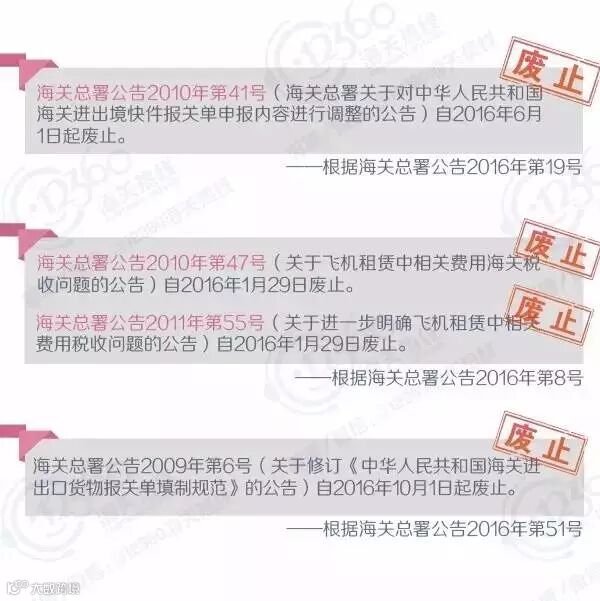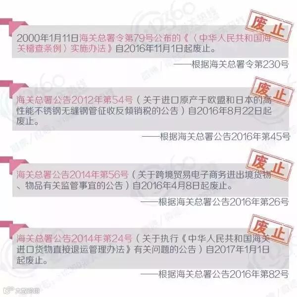 自2016年1月1日至2016年12月31日,海关总署共发布公告90个,署令1个。在新政策开始实施的同时,很多之前已发布的署令、公告、条款也被废止或停止执行了。小编把这些已经不再有效的署令、公告、条款帮大家整理了出来,提醒大家在查阅文件的时候注意文件的有效性哦!