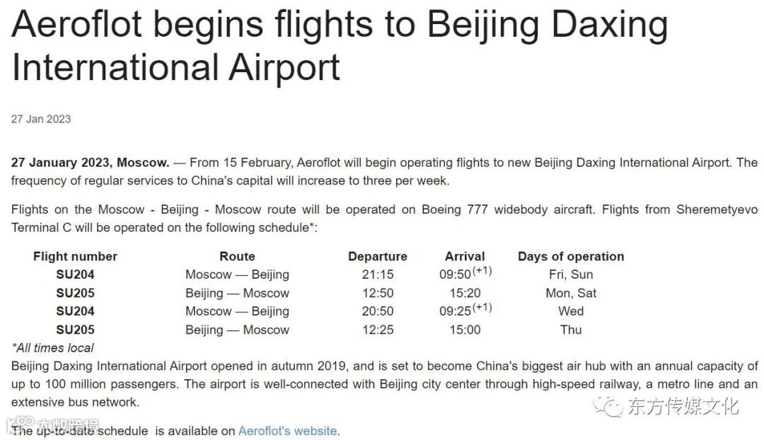俄罗斯航空:2月15日起开通赴大兴机场航班,莫斯科-北京航线增至每周三班