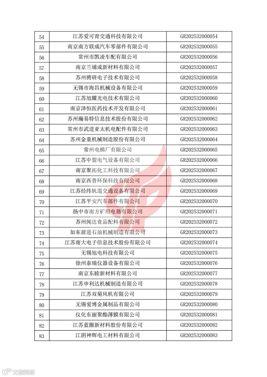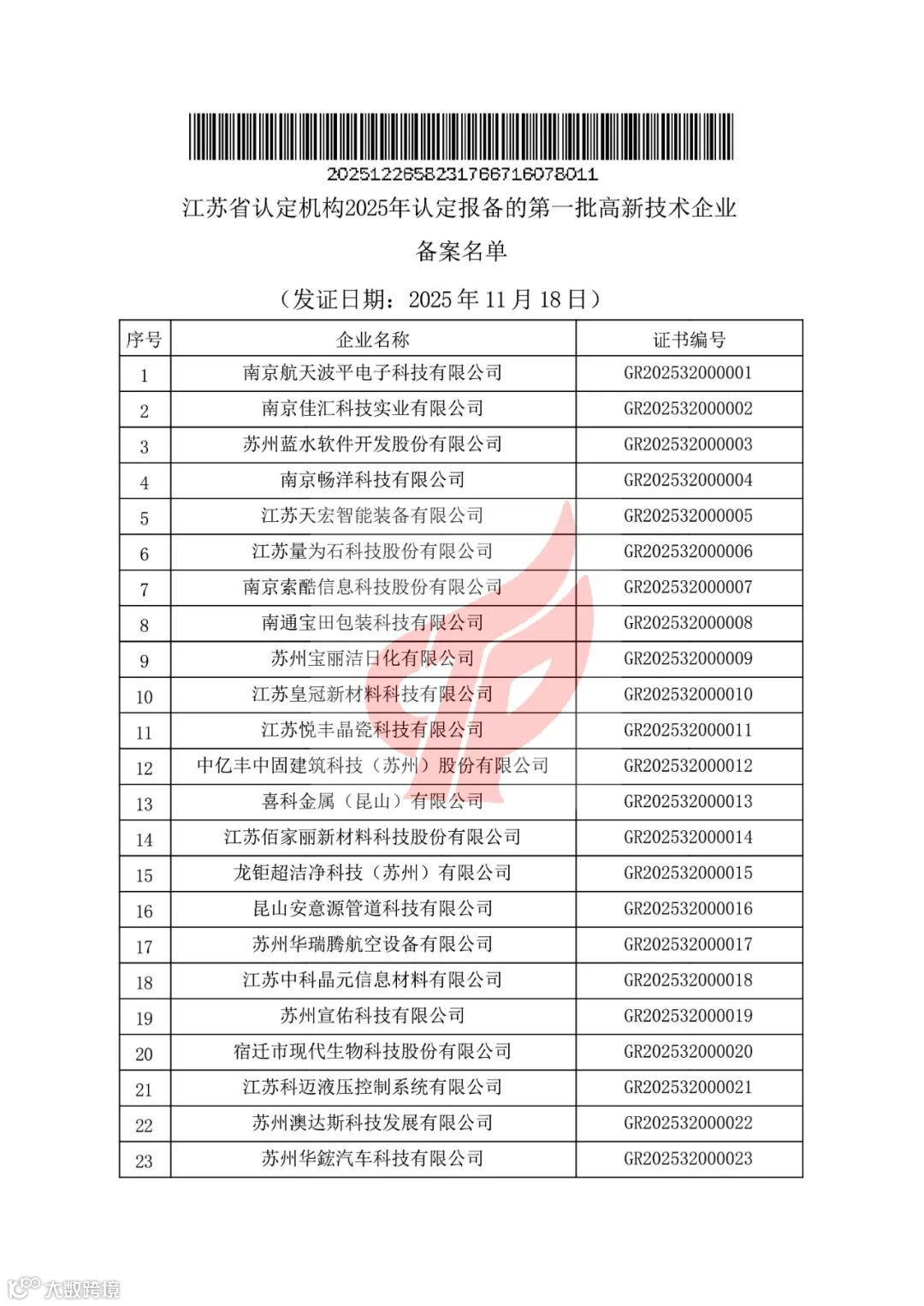 根据《-高新技术企业认定管理办法》(国科发火〔2016〕32号)和《高新技术企业认定管理工作指引》(国科发火〔2016〕195号)有关规定,现对江苏省认定机构2025年认定报备的第一批5823家高新技术企业备案名单(详见附件)予以公告。