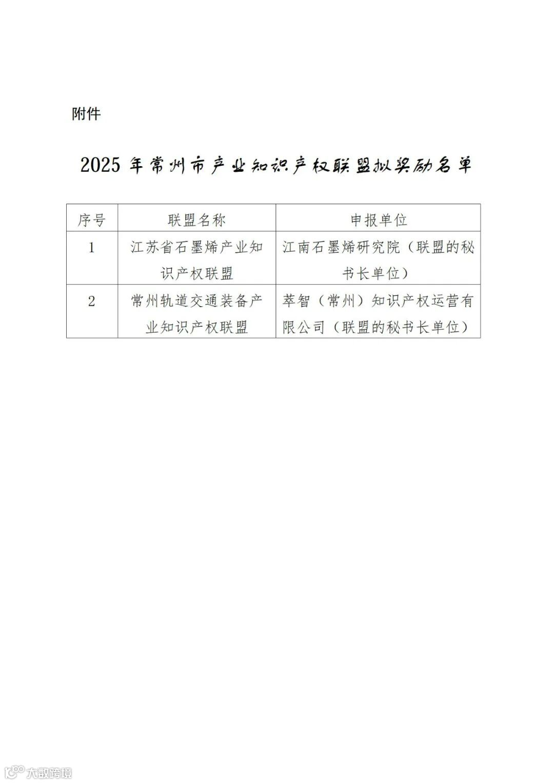按照《常州市推进知识产权强市建设的若干政策(2025年-2027年)》(常市监〔2025〕29号)和《关于组织申报2025年度常州市知识产权联盟奖励的通知》(常市监〔2025〕59号),经单位申报、辖区审核推荐、审核评价、局党组会审定等程序,现将拟奖励的产业知识产权联盟名单进行公示,公示期自2025年12月5日至12月11日。公示期间如对拟立项名单有异议的,请以书面方式向我局反映。以个人名义提出异议的,需写明自己的真实姓名、单位、职务职称、联系地址及电话等;以单位名义提出异议的,需加盖单位公章,并写明联系人和联系电话。咨询电话:知识产权规划发展处88588191。监督电话:局机关纪委88588068。