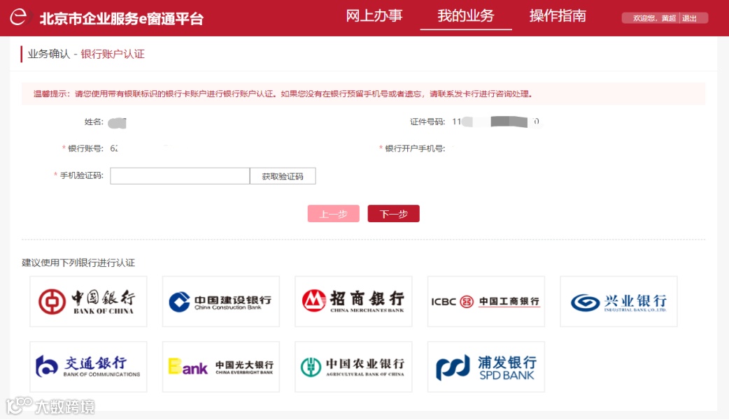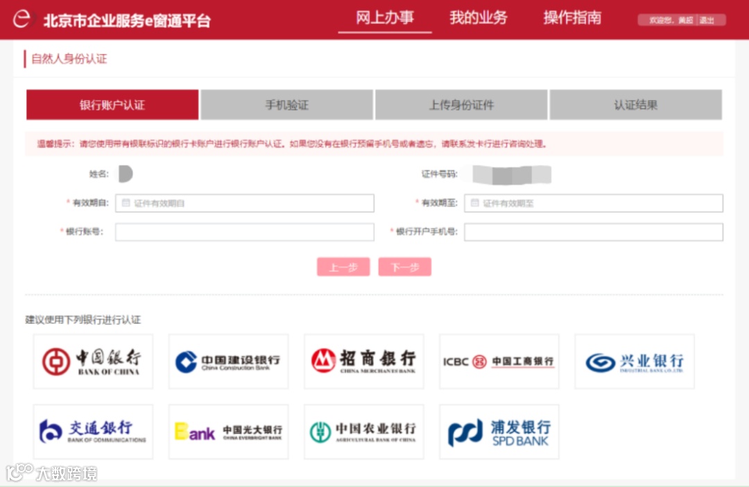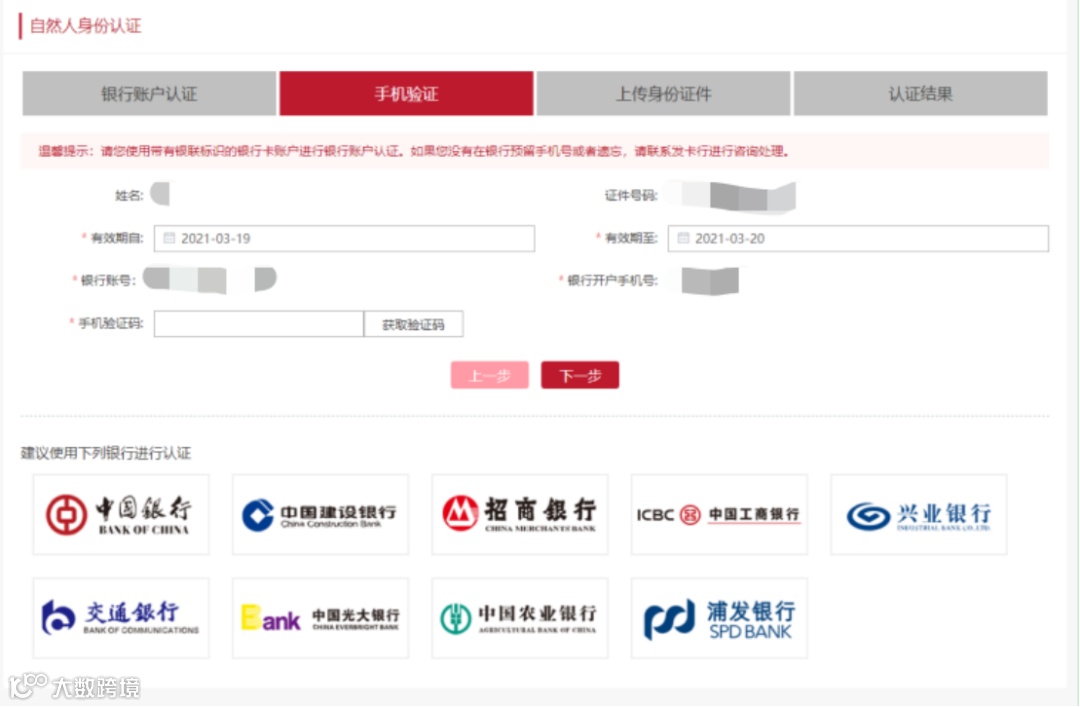 网页认证需要登记业务相关参与者亲自完成,输入信息包括银行账户信息,手机验证码,上传身份证正、反面。