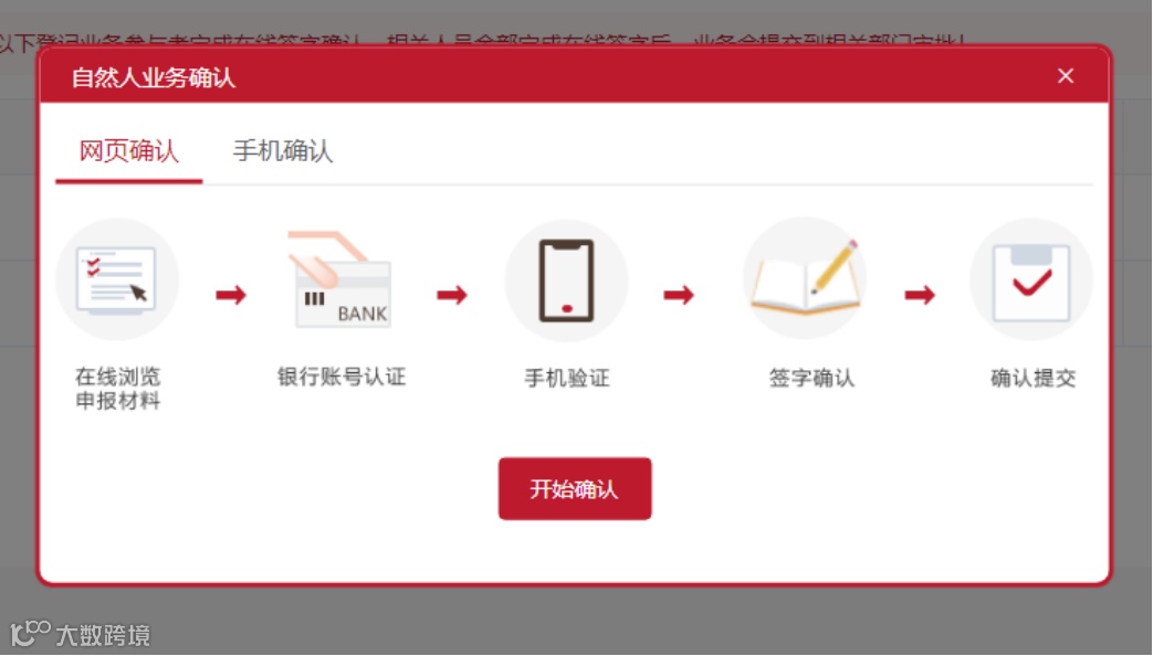 网页确认需要登记业务相关参与者亲自完成,流程为在线浏览电子申报材料、银行账户认证、手机验证、在线签字、确认提交。