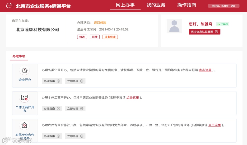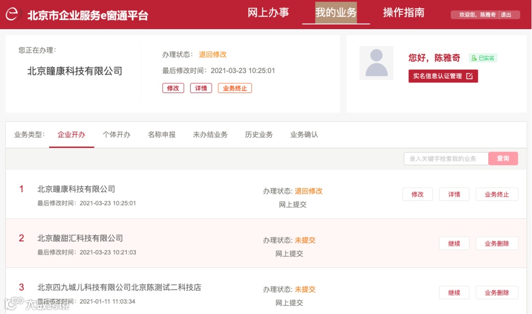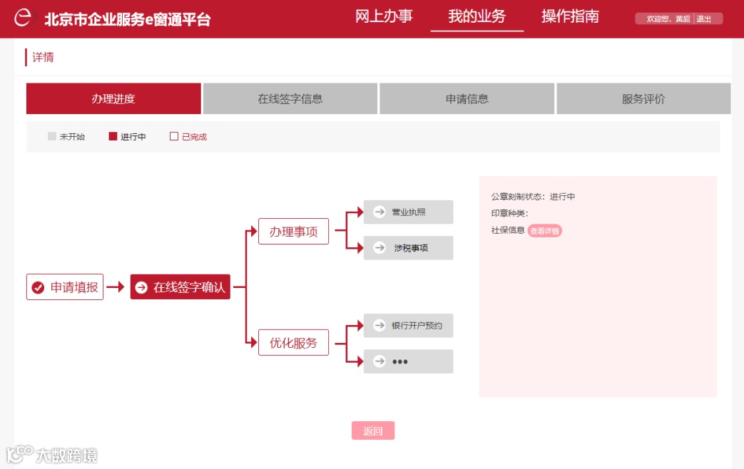 业务提交后,您可以随时登录平台,在“我的业务”中,点击某笔业务的“详情”按钮查询办理进度。