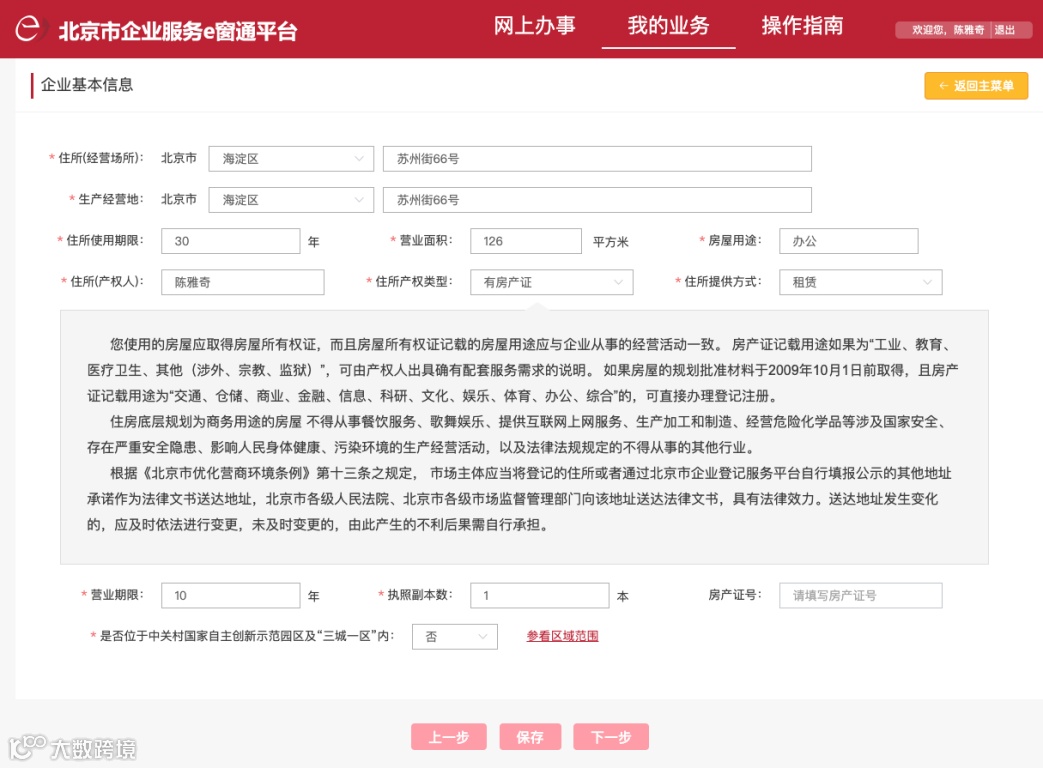 7.进入企业基本信息填报页面,填写住所、营业期限等相关信息。