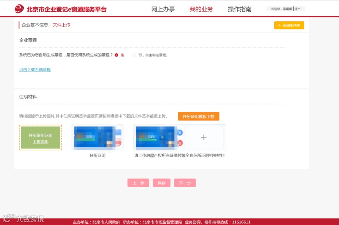 公司章程系统已自动生成,可直接使用,如企业自行制定章程,可上传系统。