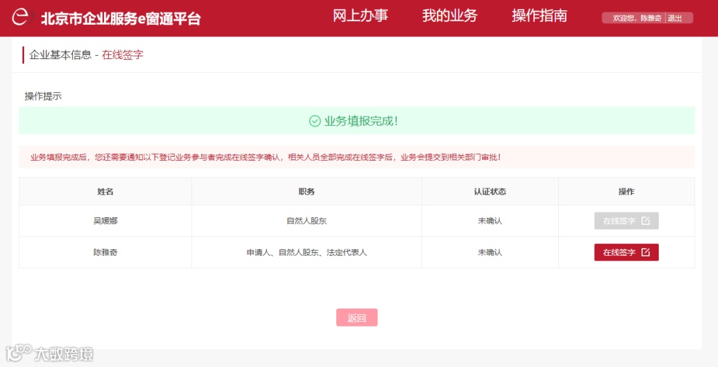 16.提交成功系统会显示业务填报完成,申请人还需要通知登记业务相关参与者完成在线签字确认。