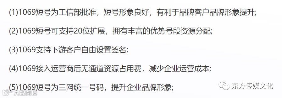 1069短号码为跨省/全国范围内非经营性短消息类服务提供接入的第三方平台专用号码,是第三方短信企业(SP企业)用于短信服务,1069短号码实现企业专有短号码,企业的短信显示号码统一,具有品牌效应。即形如10690XXX(X=0~9),可扩展用于标识接入在平台后的内容提供主体,管理位长为8位,可拓展使用。
