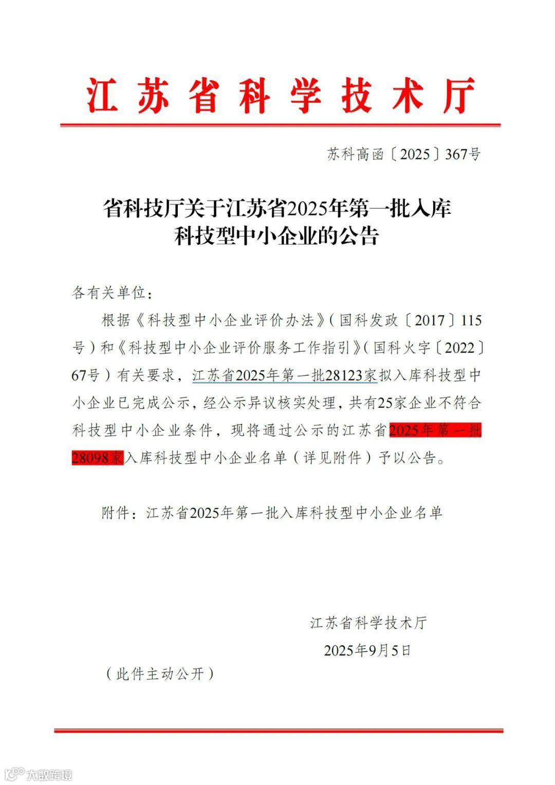 〖公示〗关于江苏省2025年第一批入库科技型中小企业的公告