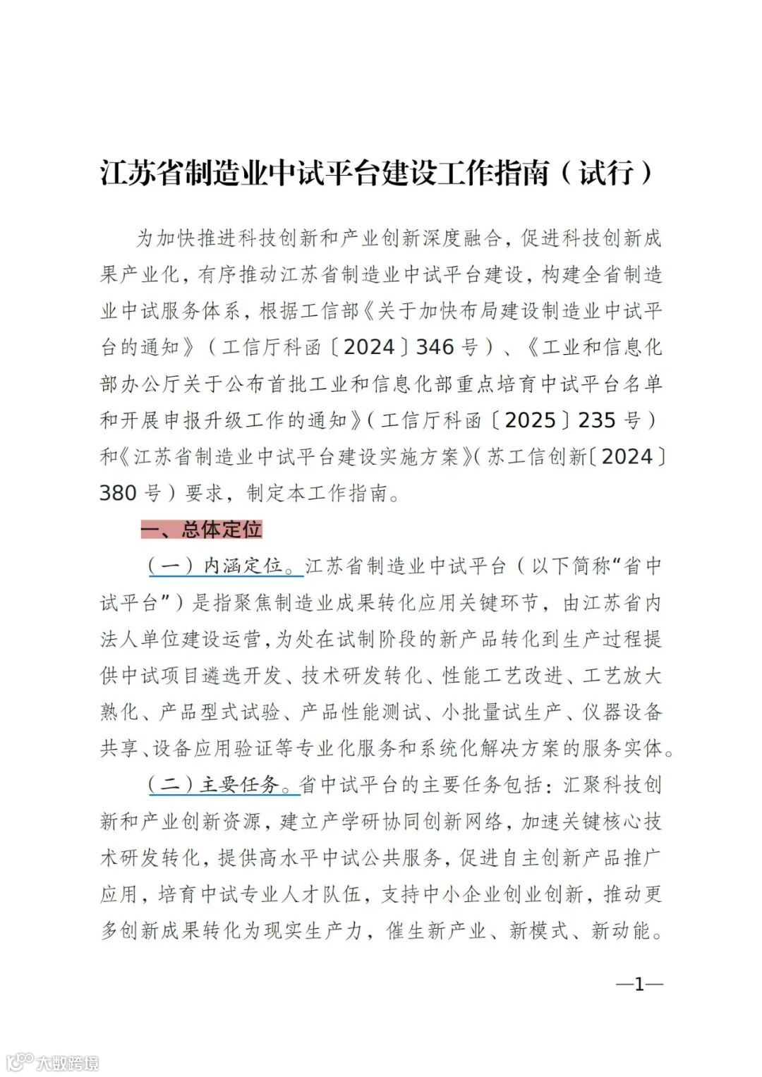 〖通知〗关于印发《江苏省制造业中试平台建设工作指南(试行)》的通知