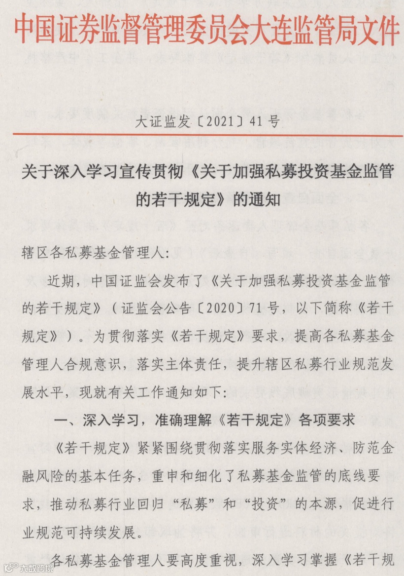 近日,大连证监局发布《关于深入学习宣传贯彻<关于加强私募投资基金监管的若干规定>的通知》,要求各私募管理人高度重视,深入学习掌握《若干规定》精神。