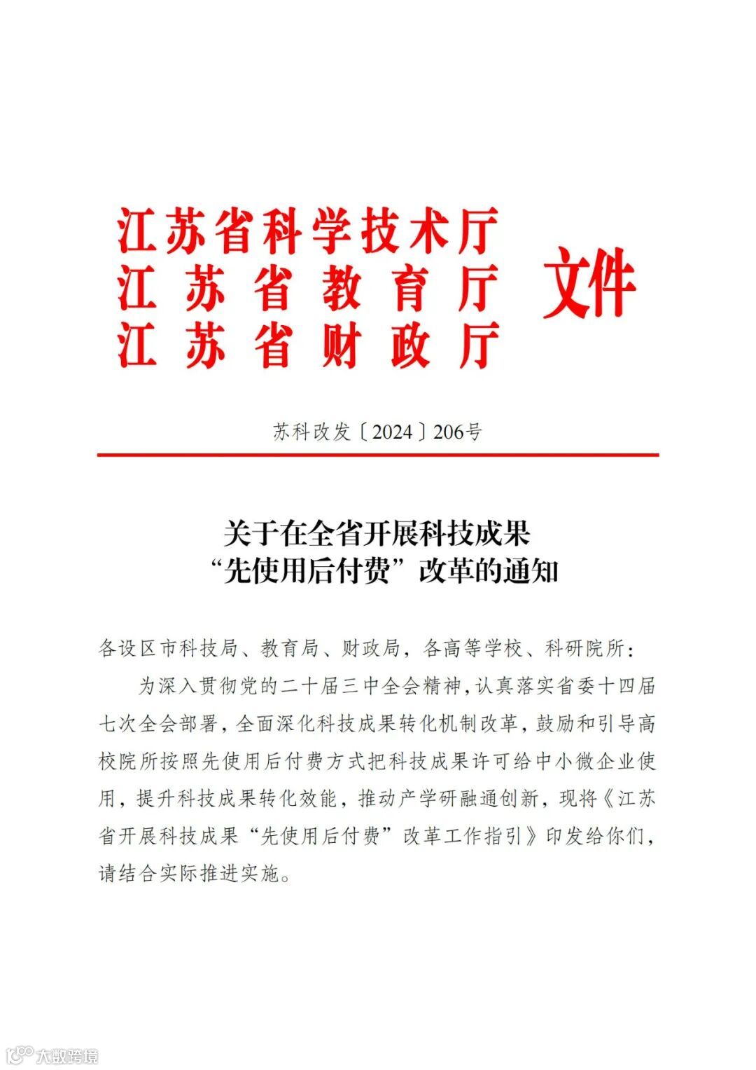 〖通知〗关于在全省开展科技成果“先使用后付费”改革的通知