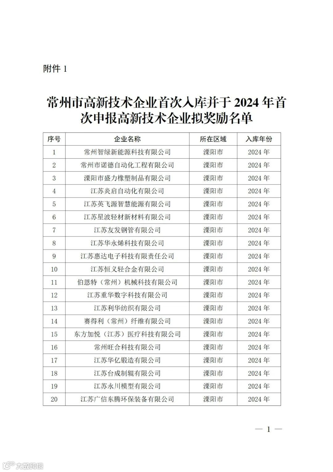 1.常州市高新技术企业首次入库并于2024年首次申报高新技术企业拟奖励名单