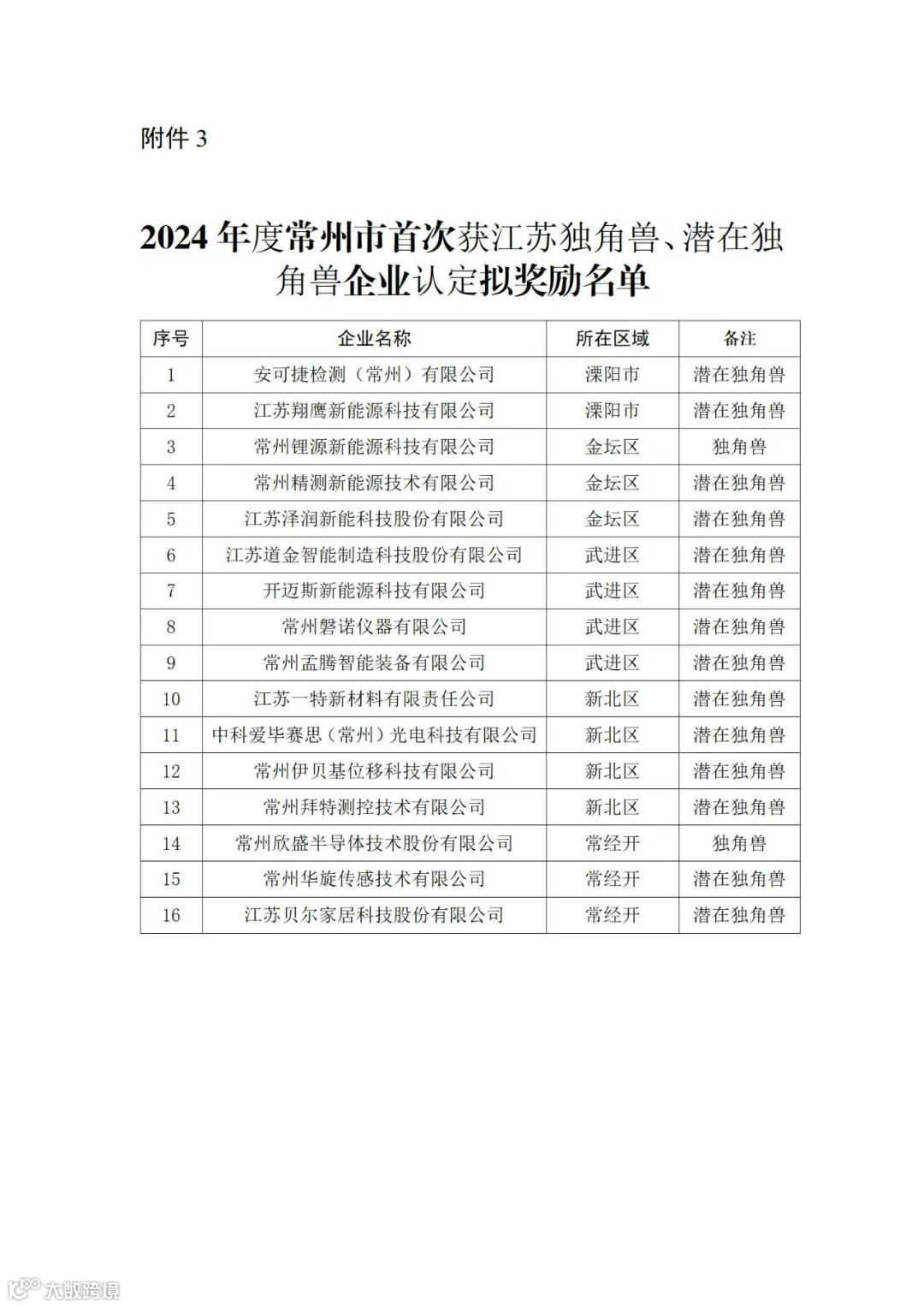 3.2024年度常州市首次获江苏独角兽、潜在独角兽企业认定拟奖励名单
