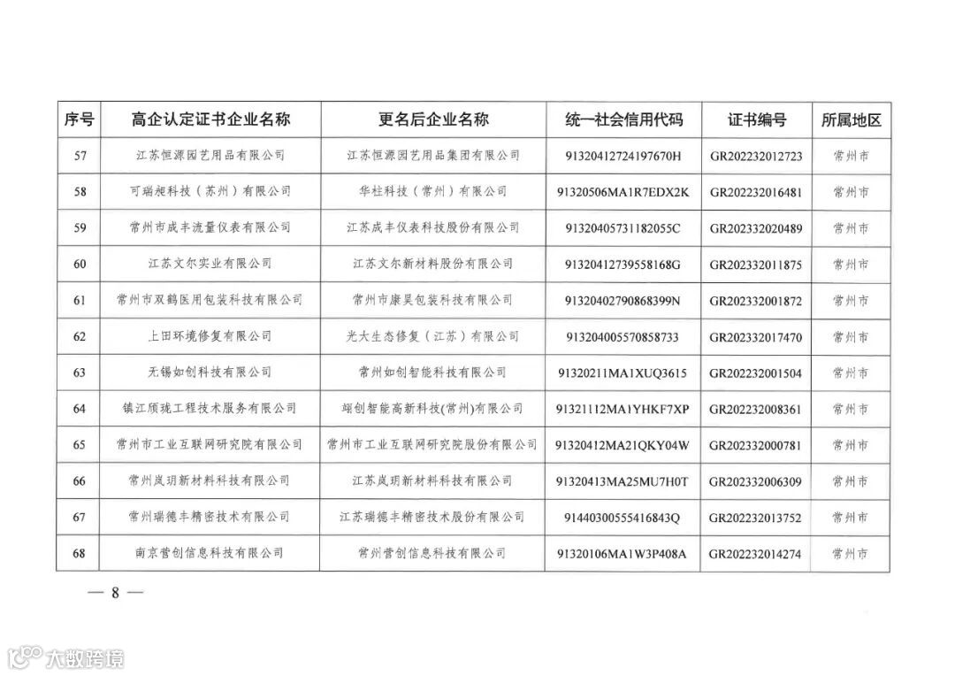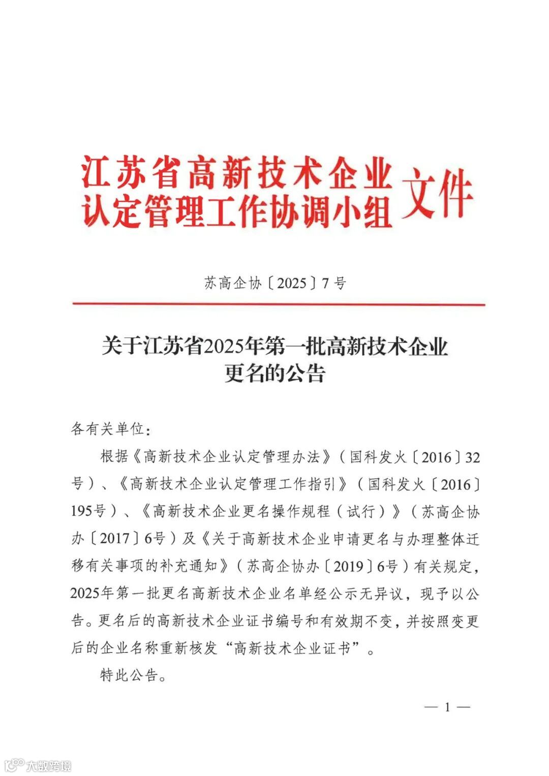 〖公示〗关于江苏省2025年第一批高新技术企业更名的公告