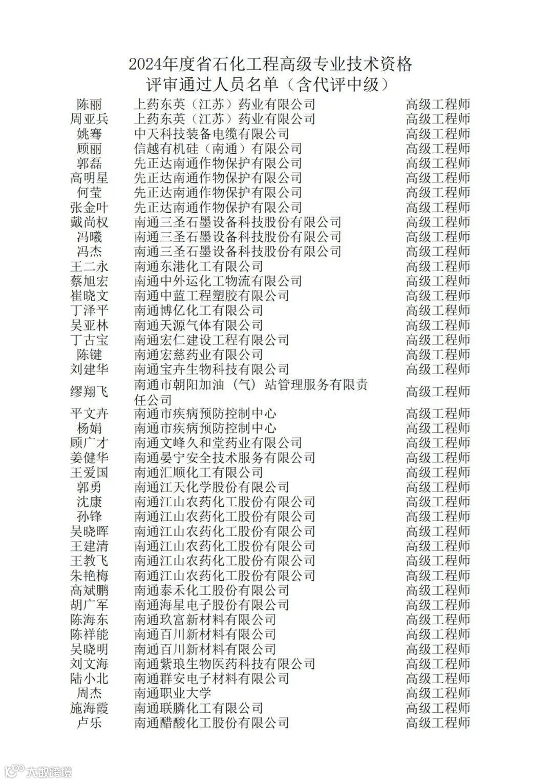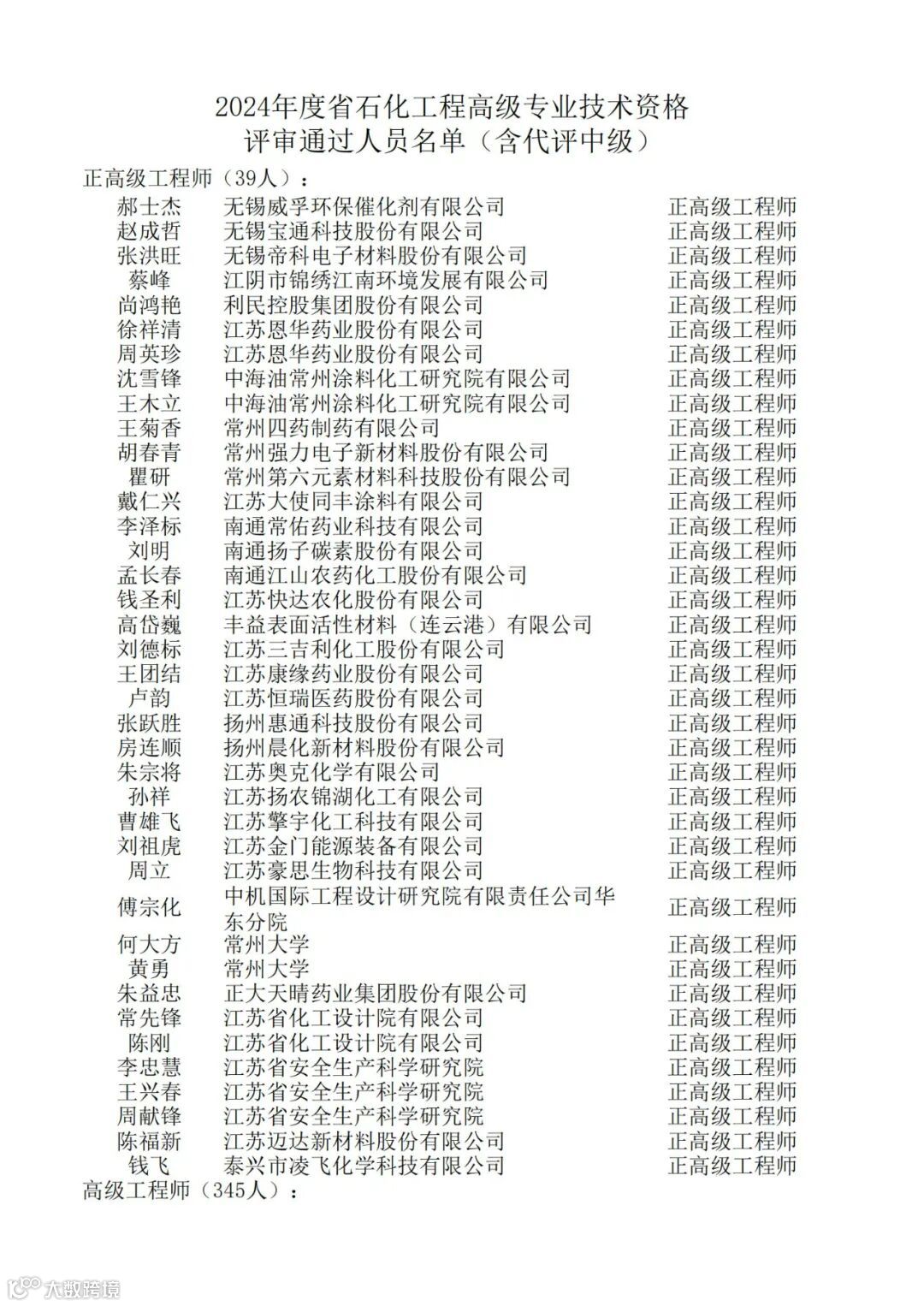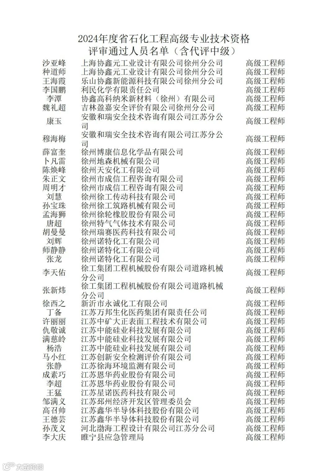 按照《省人力资源社会保障厅关于做好2024年度职称评审工作的通知》要求,经省石化工程高级专业技术资格评审委员会评审,郝士杰等39人具备正高级工程师资格,沙亚峰等345人具备高级工程师资格,王如霞等20人具备工程师资格。现对评审通过人员名单予以公示,