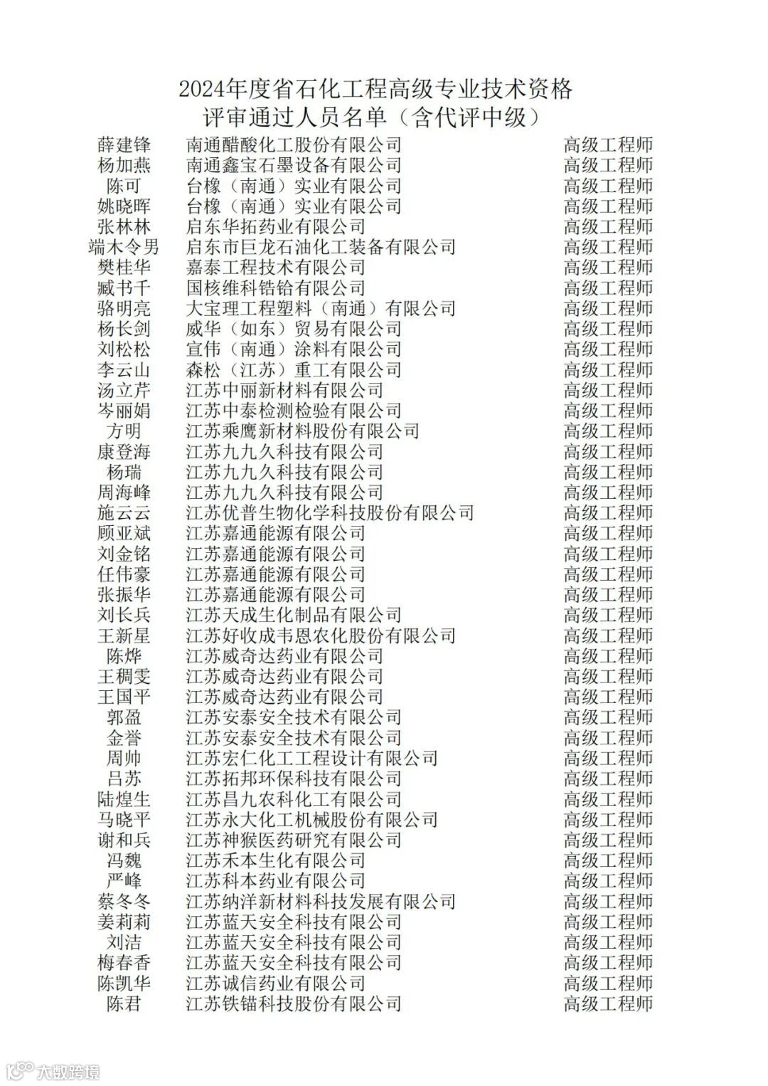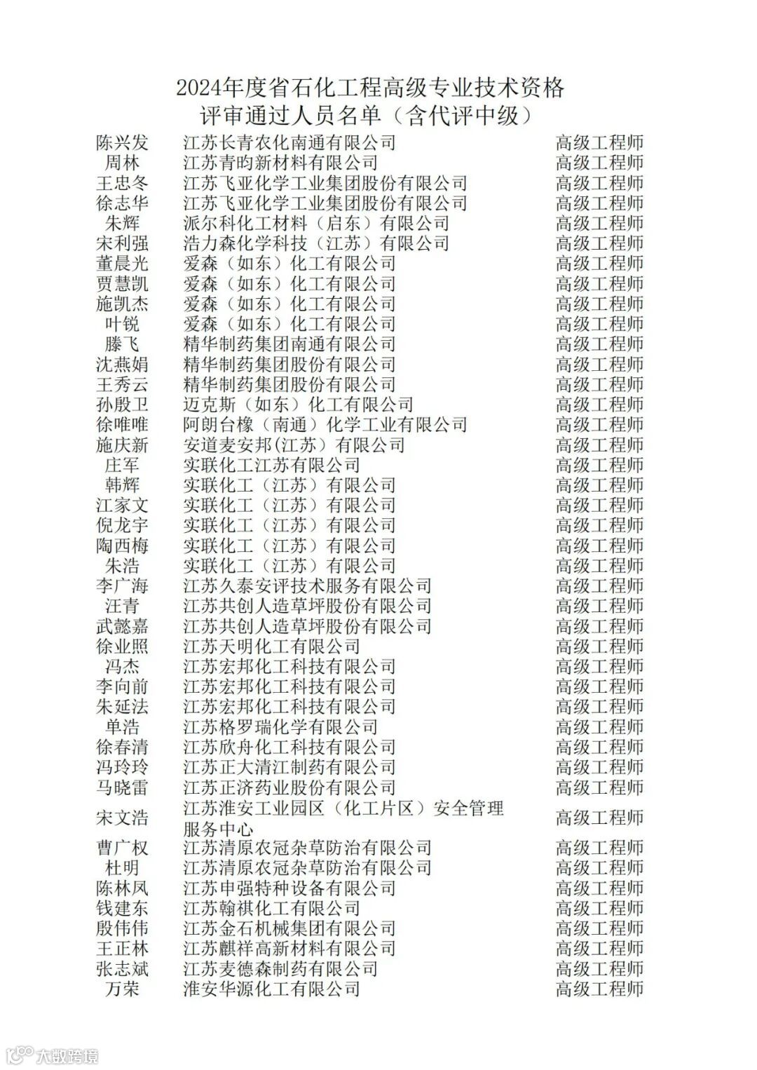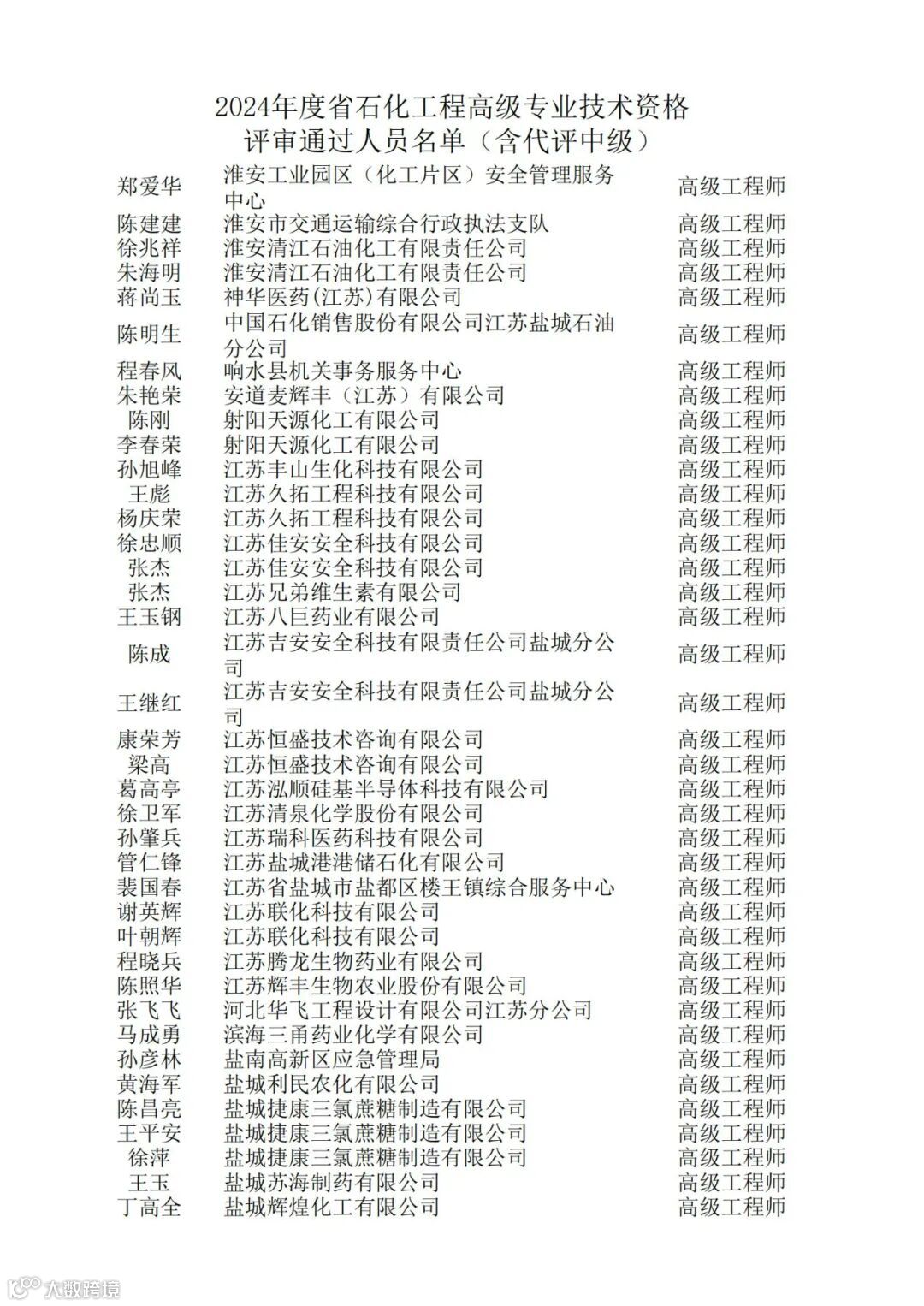 按照《省人力资源社会保障厅关于做好2024年度职称评审工作的通知》要求,经省石化工程高级专业技术资格评审委员会评审,郝士杰等39人具备正高级工程师资格,沙亚峰等345人具备高级工程师资格,王如霞等20人具备工程师资格。现对评审通过人员名单予以公示,