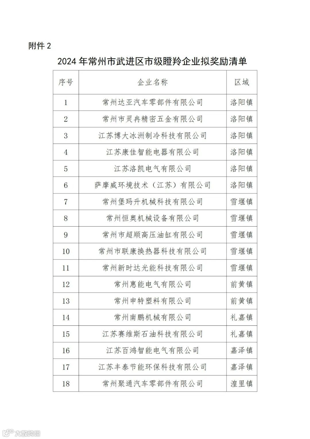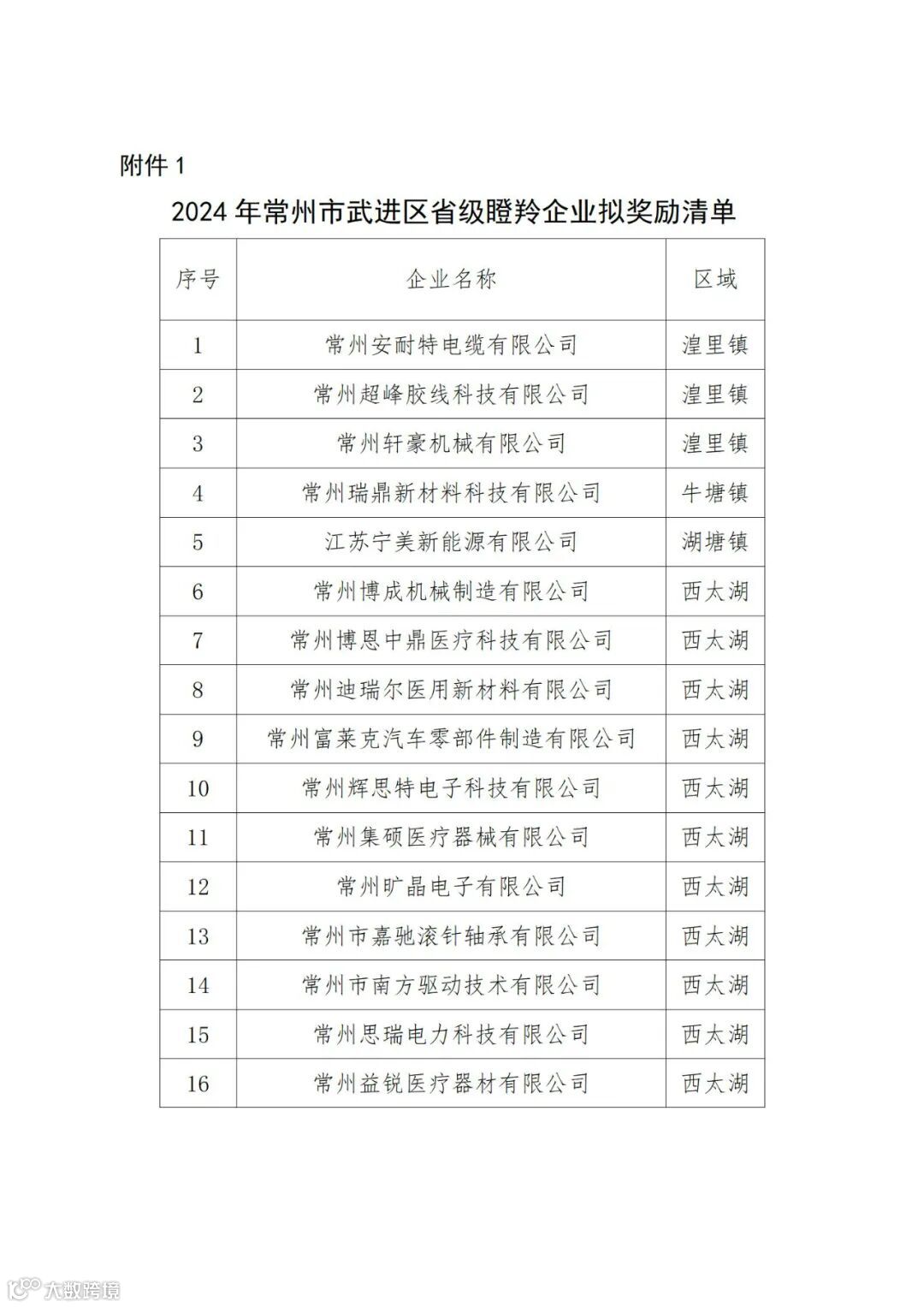 〖公示〗关于2024年常州市武进区瞪羚企业拟奖励名单的公示
