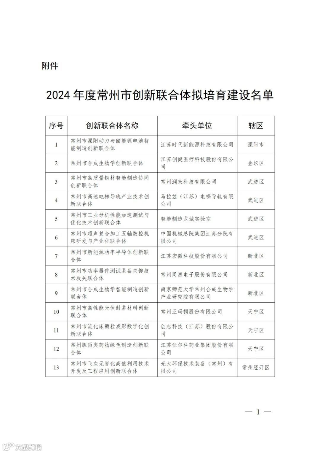 〖公示〗关于对2024年度常州市创新联合体拟培育建设名单的公示