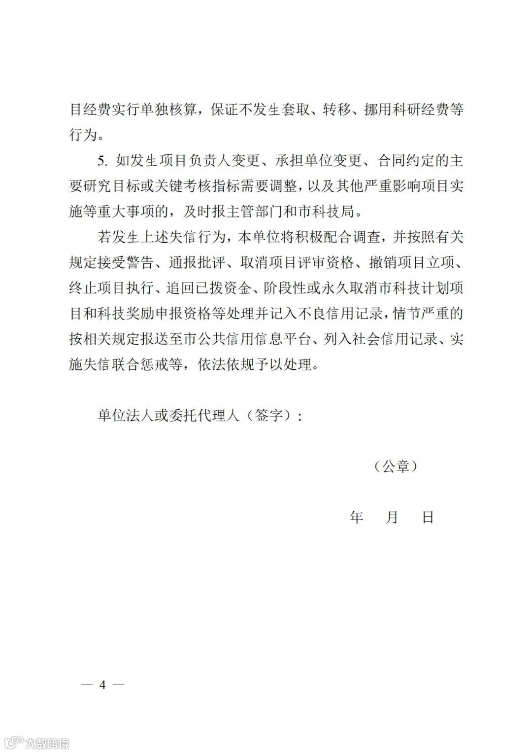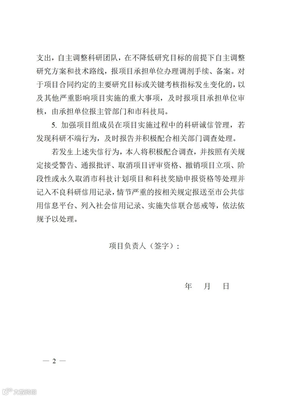 2.全面实施科研诚信承诺制。项目负责人和承担单位必须在项目申报时签署科研诚信承诺书,进一步明确各自承诺事项和违背相关承诺的责任。有不良信用记录的单位和个人,不得申报本年度市科技计划项目。