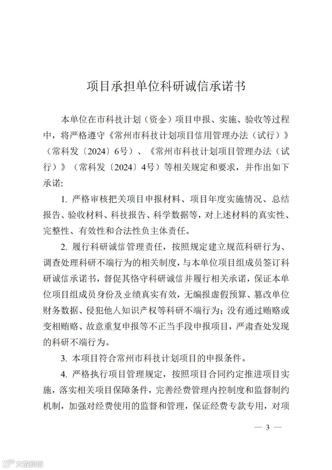3.严格落实审核推荐责任,项目申报单位和主管部门按照《常州市科技计划项目管理办法(试行)》(常科发〔2024〕4号)等文件要求,对申报材料内容进行严格把关,严格履行项目审核推荐职责。项目申报单位对申报材料的真实性和合法性负有法人主体责任,在项目申报、立项和实施过程中相关责任主体有弄虚作假、学术剽窃、冒名顶替、侵犯他人知识产权等不良信用行为的,一经查实,将记入信用档案,并按《常州市科技计划项目信用管理办法(试行)》(常科发〔2024〕6号)做出相应处理。