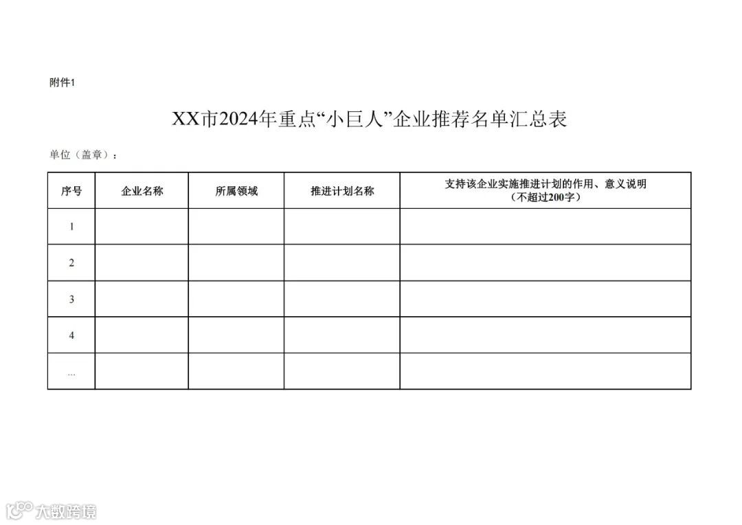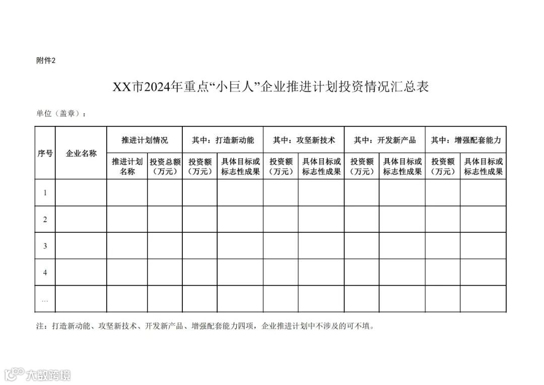 请各地对企业填报内容及佐证材料进行初审核实,会同财政部门遴选符合条件的企业,按照分配名额提出推荐名单。填报《××市2024年重点“小巨人”企业推荐名单汇总表》(附件1)和《××市2024年重点“小巨人”企业推进计划投资情况汇总表》(附件2)。