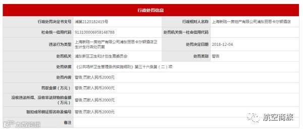 上海浦东新区卫计委对上海浦东丽思卡尔顿酒店作出行政处罚。图片来源:信用中国(上海.浦东)官网