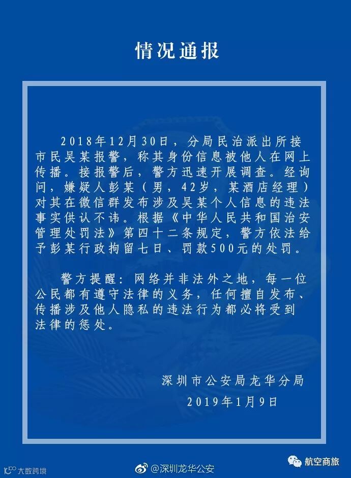 1月9日,深圳龙华公安通报花总信息泄露案件。嫌疑人彭某(男,42岁,某酒店经理)对其在微信群发布涉及吴某个人信息的违法事实供认不讳。警方依法给予彭某行政拘留七日、罚款500元的处罚。