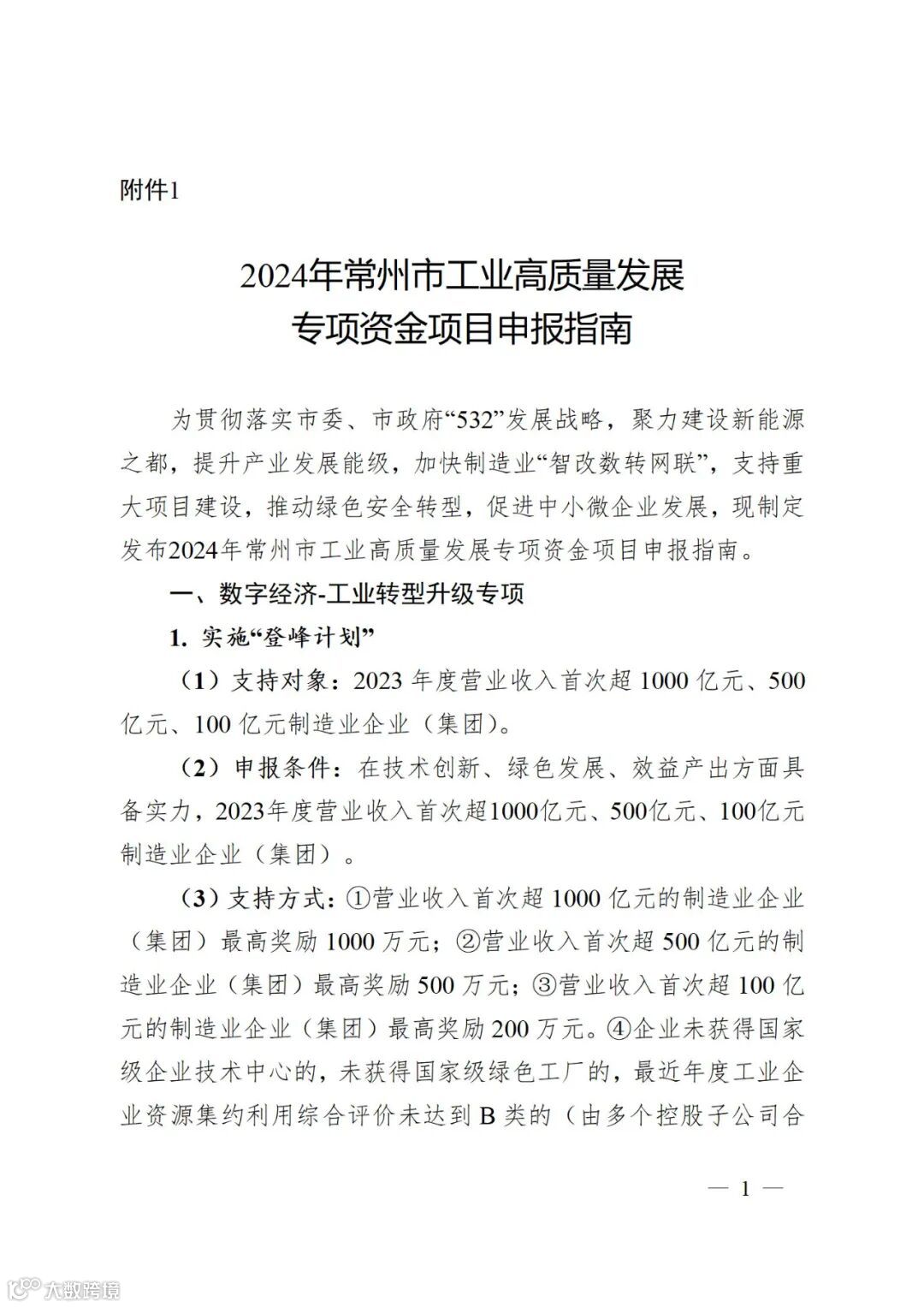 1. 2024年常州市工业高质量发展专项资金项目申报指南