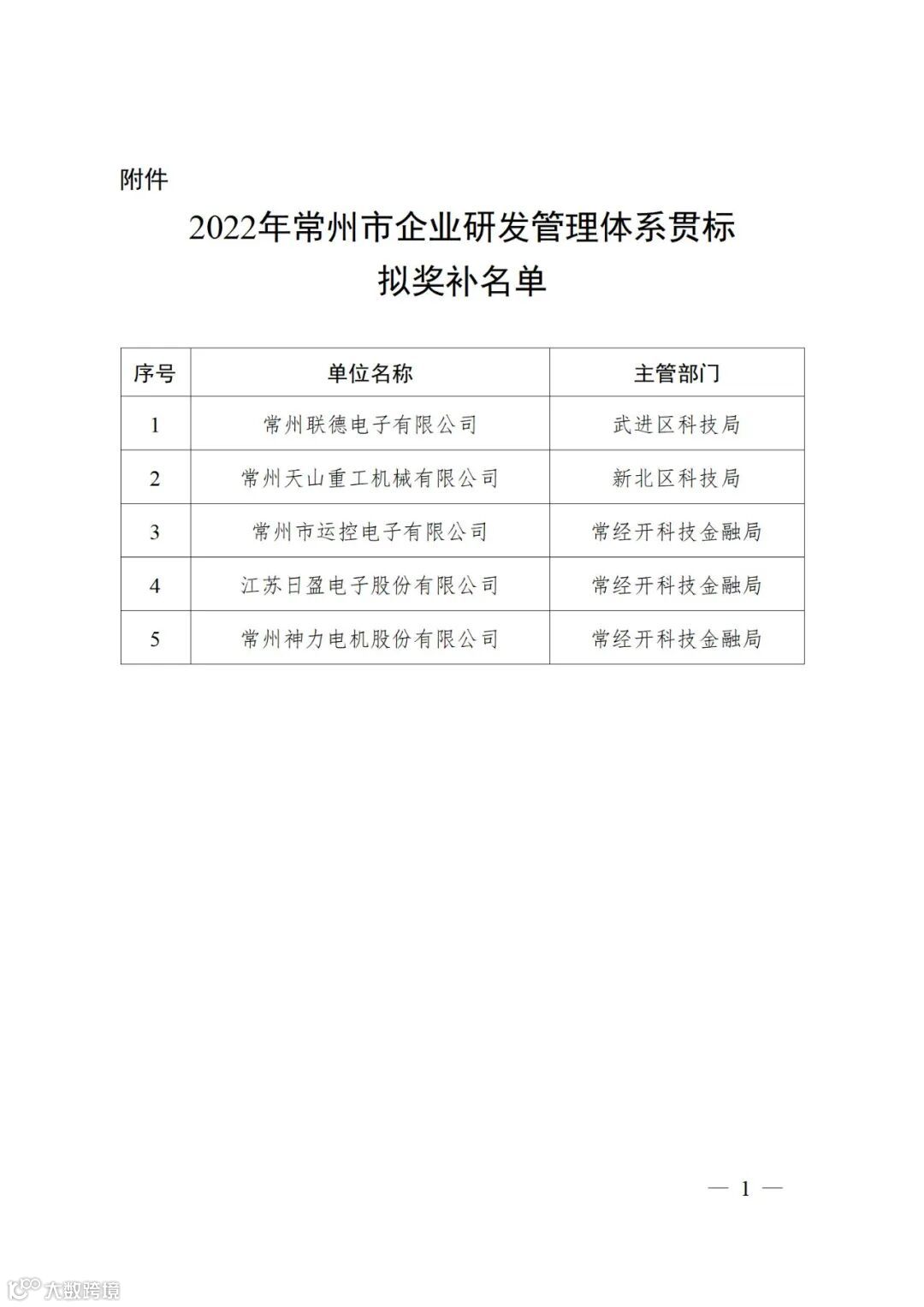 〖公示〗关于2022年常州市企业研发管理体系贯标拟奖补名单的公示