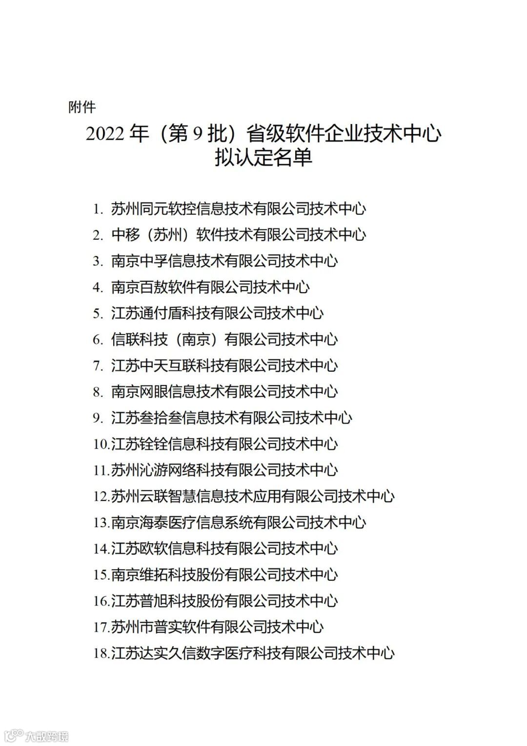 根据《江苏省省级企业技术中心认定管理办法》(苏工信规﹝2020﹞1号)和《关于组织开展2022年(第9批)江苏省省级软件企业技术中心认定工作的通知》(苏工信创新〔2022〕160号)要求,我厅组织开展了2022年(第9批)省级企业技术中心认定工作。经企业申报、各市推荐、形式审查、专家评审等程序,现将拟认定名单予以公示(名单附后)。