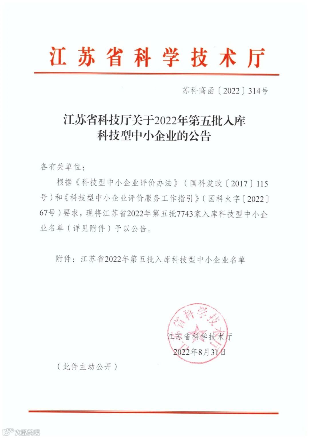 〖公示〗江苏省科技厅关于2022年第五批入库科技型中小企业的公告