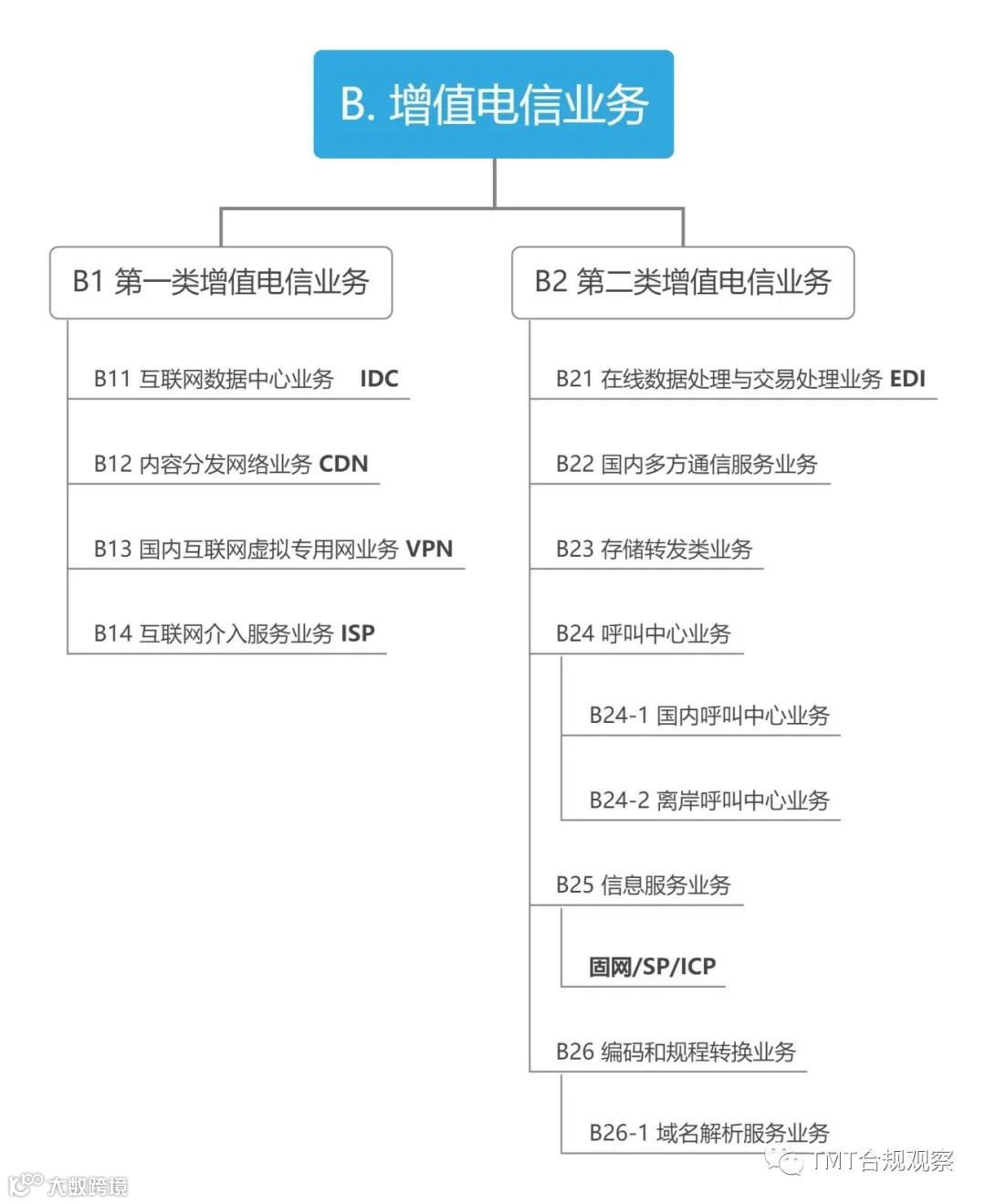 根据《中华人民共和国电信条例(2014修订)》及工信部《电信业务分类目录(2015年版)》,电信业务分为基础电信业务和增值电信业务,增值电信业务按照服务基于设施与资源类、基于公共应用平台类分为第一类增值电信业务和第二类增值电信业务,具体分类如下:
