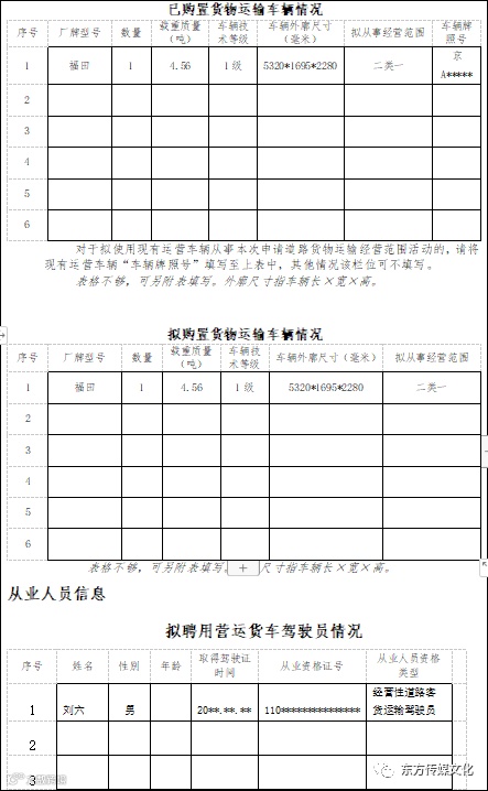 5、已购置运输车辆的,提供机动车辆行驶证、车辆检测合格证明复印件;拟购置运输车辆的承诺书,承诺书应当包括车辆数量、类型、环保标准、技术等级、车轴数以及车辆外廓尺寸等内容;申请专用运输的,还须提供专用运输专用容器、设施、设备清单;申请大型物件运输的,还须提供超重型车组名称、装载能力及配套附件清单;已(拟)购车辆为自卸车的,还须提供承运物品情况说明;承诺期限不得超过6个月