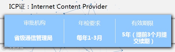 许可证续期是指原有许可证5年有效期到期后,公司想要继续使用,就需要向主管部门提交续办申请。注:全网在工信部申请,地网在公司注册所在地的通信管理局申请。