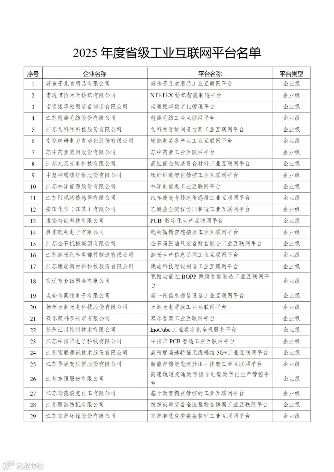 根据《关于组织开展2025年度江苏省工业互联网平台申报工作的通知》要求,经企业申报、各地推荐、专家评审、会审审议等程序,现将2025年度省级工业互联网平台名单(详见附件)予以公示。公示期为2025年12月19—25日,如有异议,请在公示期内实名反馈省工业和信息化厅,并提供佐证材料和联系方式。